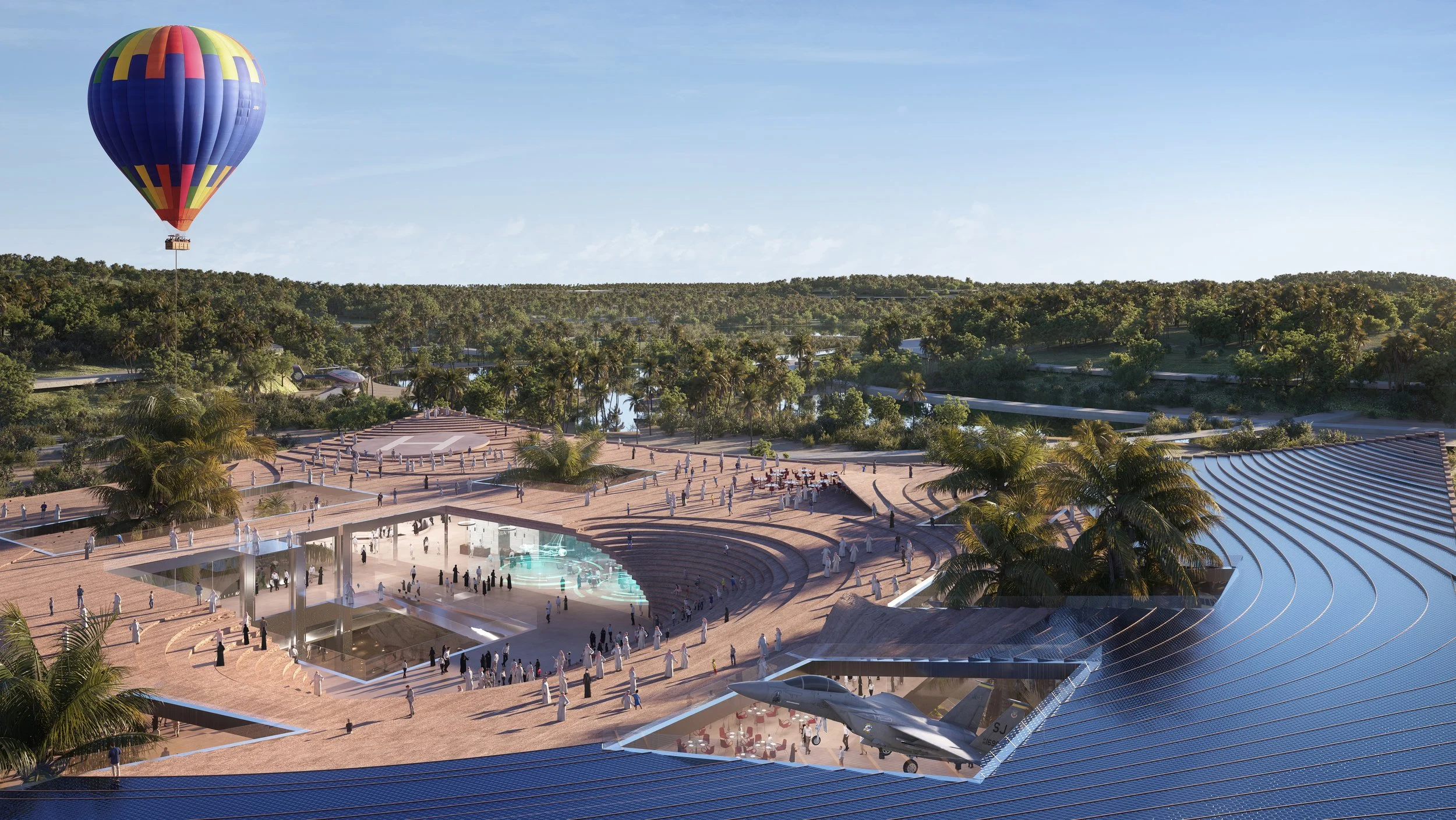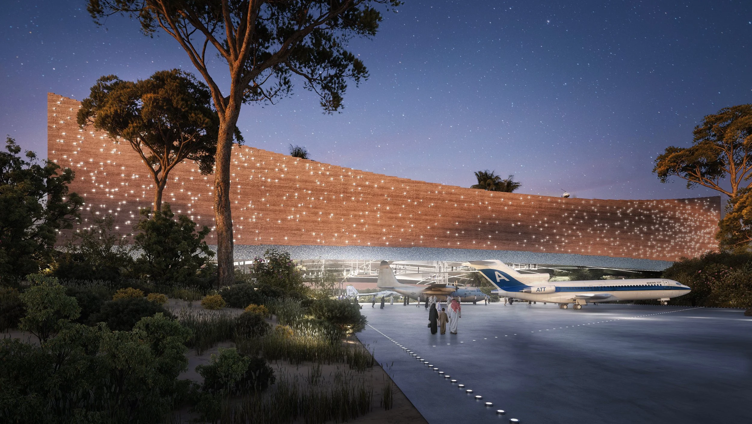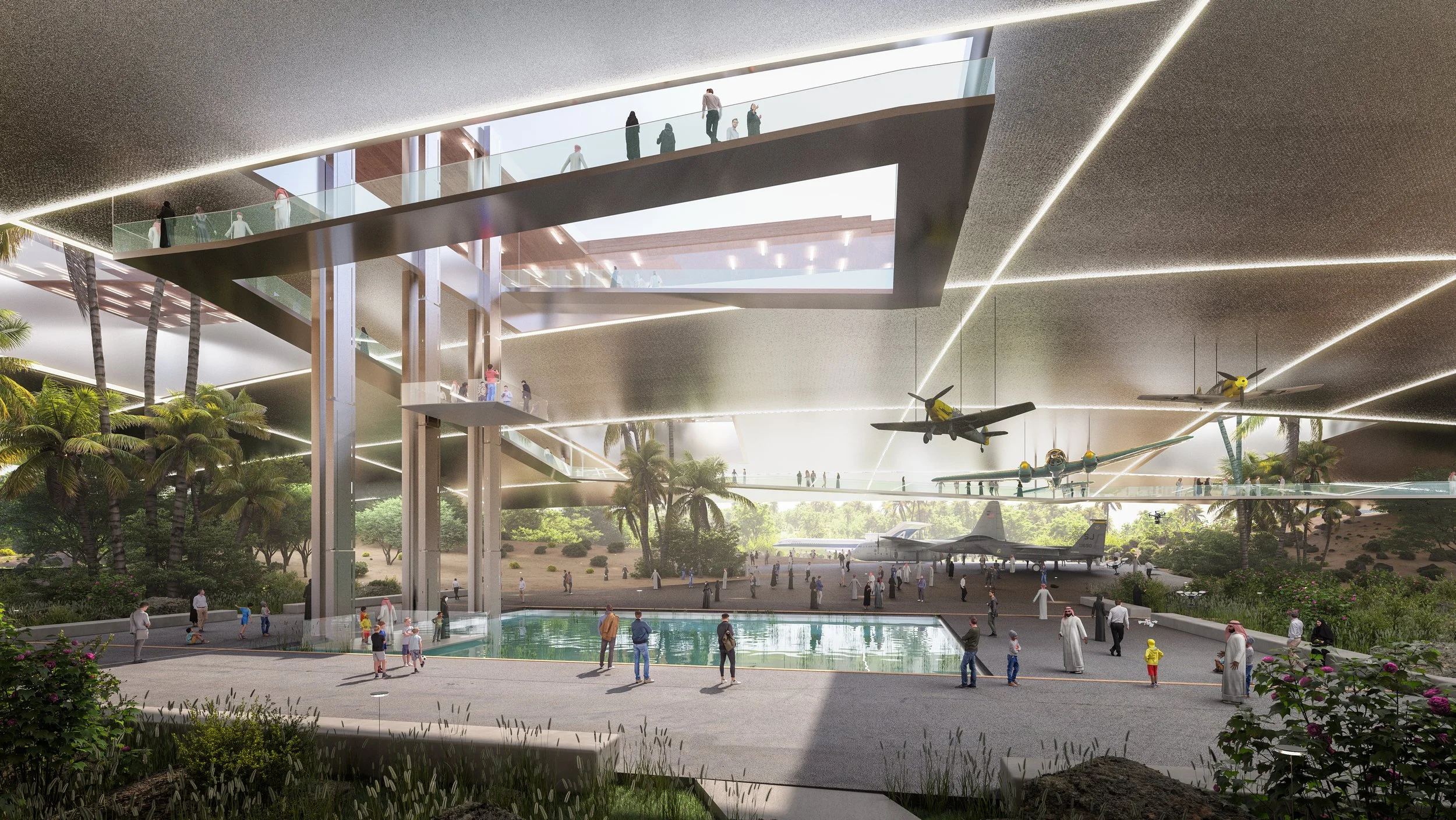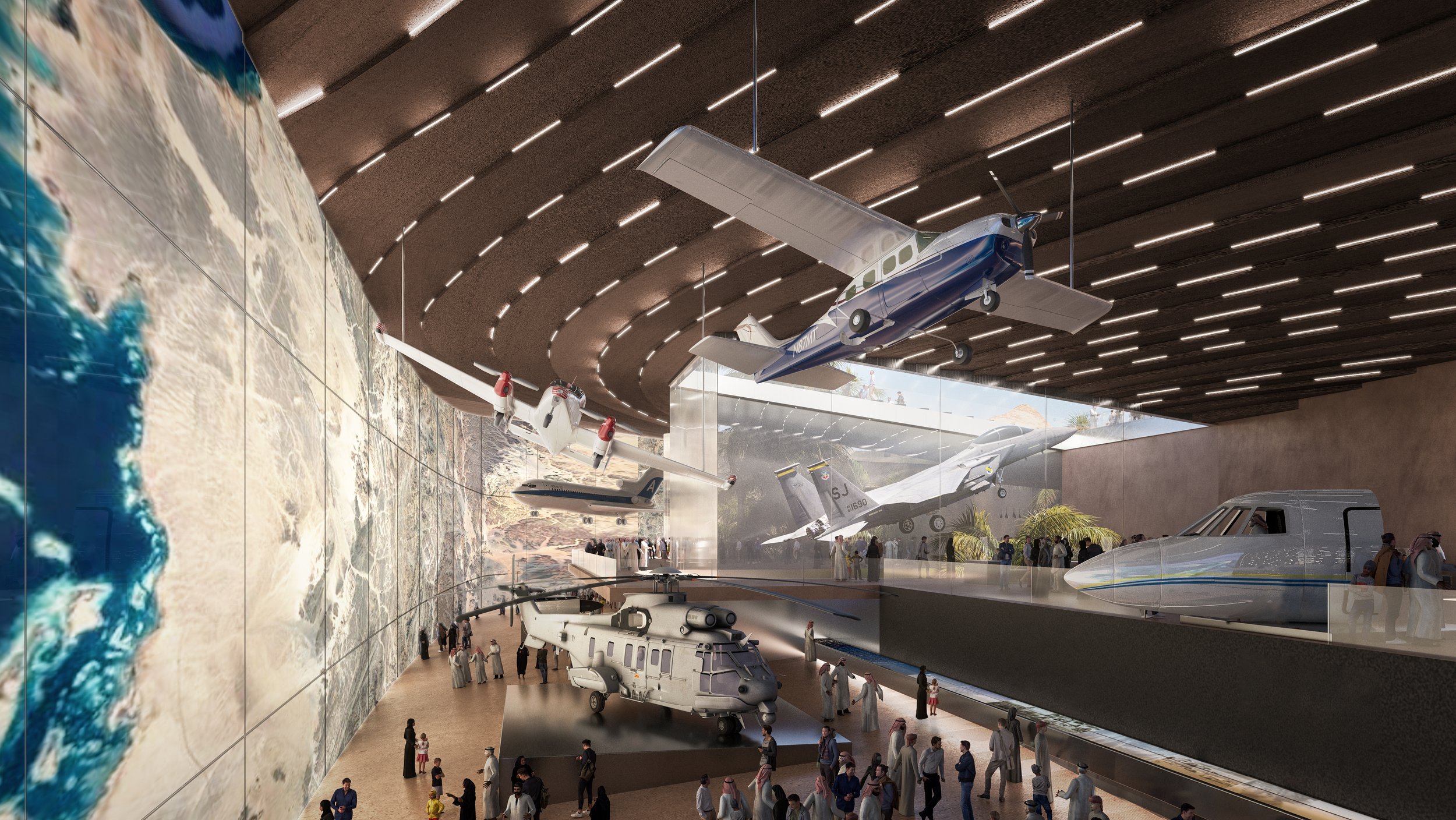 Four dunes at the corners of the site extend the topography and landscape of King Salman Park. The building touches the ground at all four points, establishing a vast protective canopy over the site. At its center, the Riyad, a courtyard at the intersection of the access flows to the heart of the gardens, marks a gathering place leading to the museum. Once raised to museum level, the vestibule houses all the museum's public functions. The galleries, known as the nave, form a continuous double-height passageway, engaging visitors and allowing a multitude of museographic situations and possibilities. As a backdrop to the suspended aircraft, the contiguous screen surrounds the entire nave, giving the impression of aircraft moving through time. Above, the topographical roof accommodates gathering, rest and performance areas, while offering panoramic views of King Salman Park and the city of Riyadh.