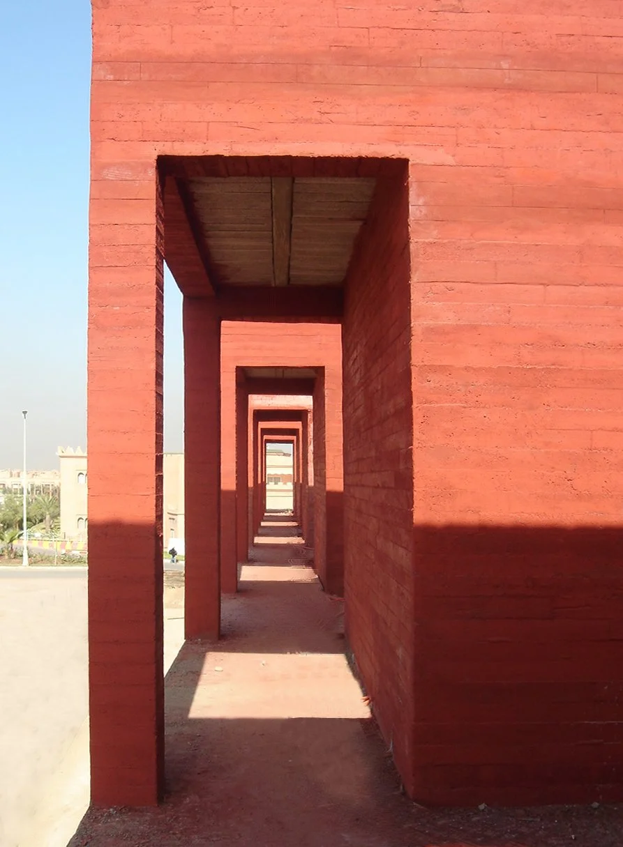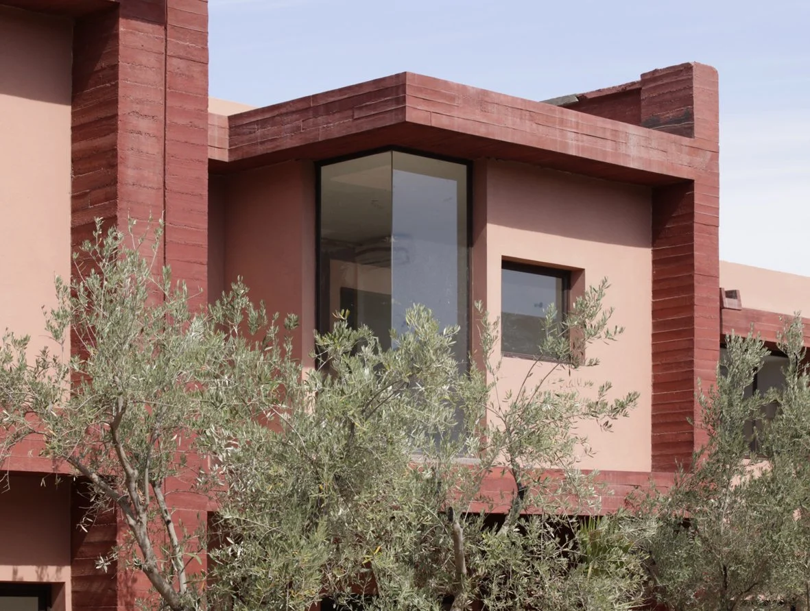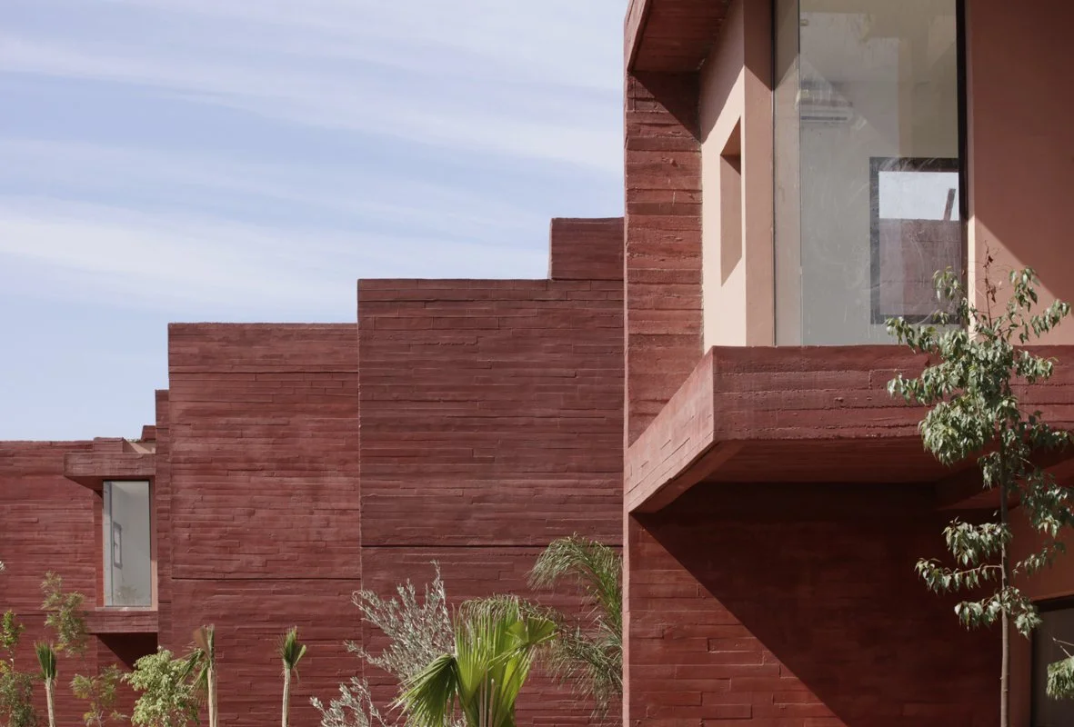 This complex, built entirely in red-tinted concrete, is composed of two long volumes, interlaced with a series of bridges, which hang suspended in the heavily forested central garden of the hotel. Containing duplex suites with private terraces, these bridges float over the wide and uninterrupted expanse of the ground, providing shaded walkways for circulation. The villas are composed of simple and sober volumes reminiscent of the heavy earthen architecture of southern Morocco. The central garden of the villas creates a sense of community while respecting the private limits of each residence; in contrast, the forested garden of the hotel serves to screen each room from its neighbors, thereby ensuring privacy. This shifting contrast of intimacy and community is a constant theme within the project.