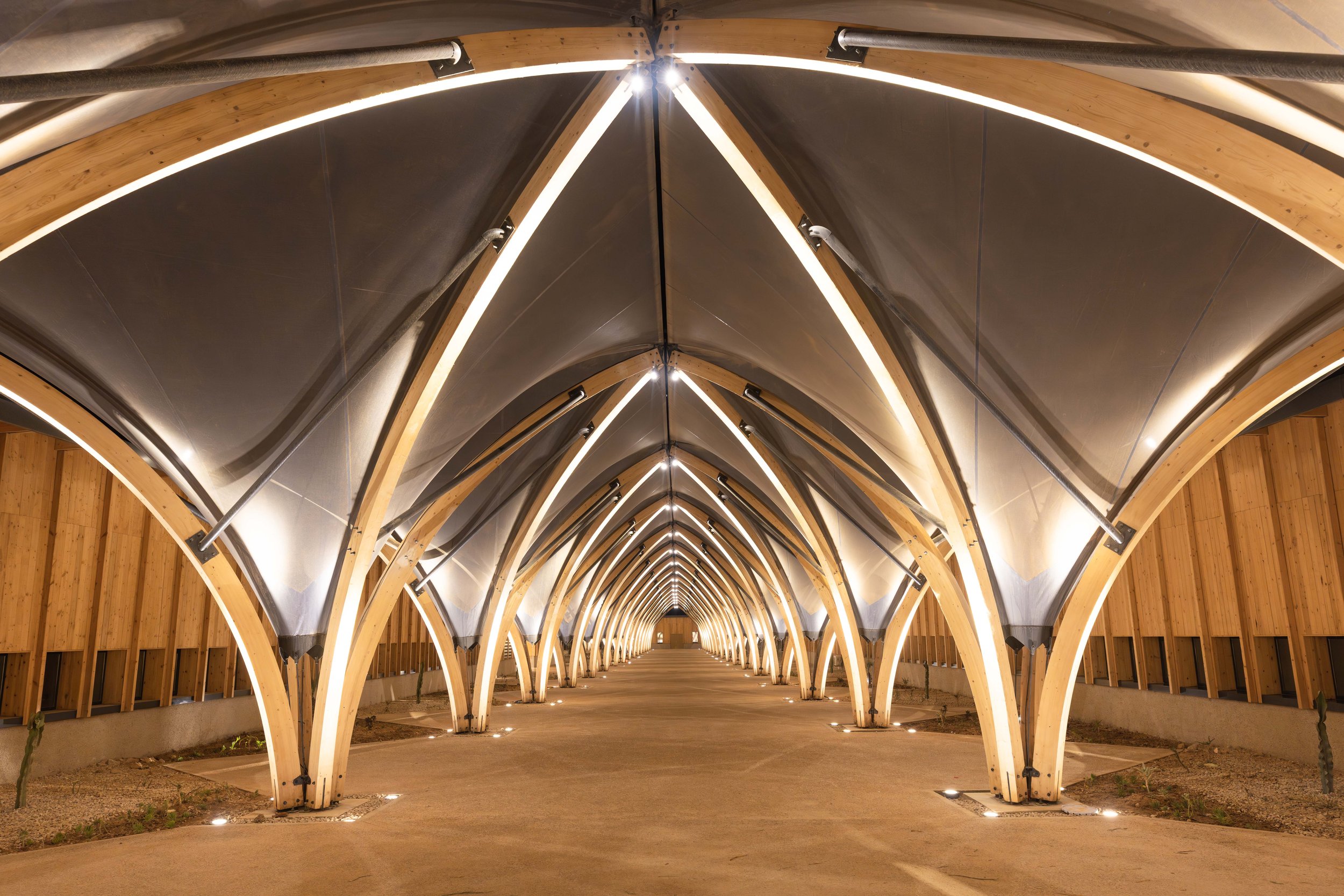 Les aménagements extérieurs, cheminements logistiques, parking et pavillons techniques, découlent du même tracé des dunes et des tracés paysagers, et ce pour participer au dispositif « brise-vent ».