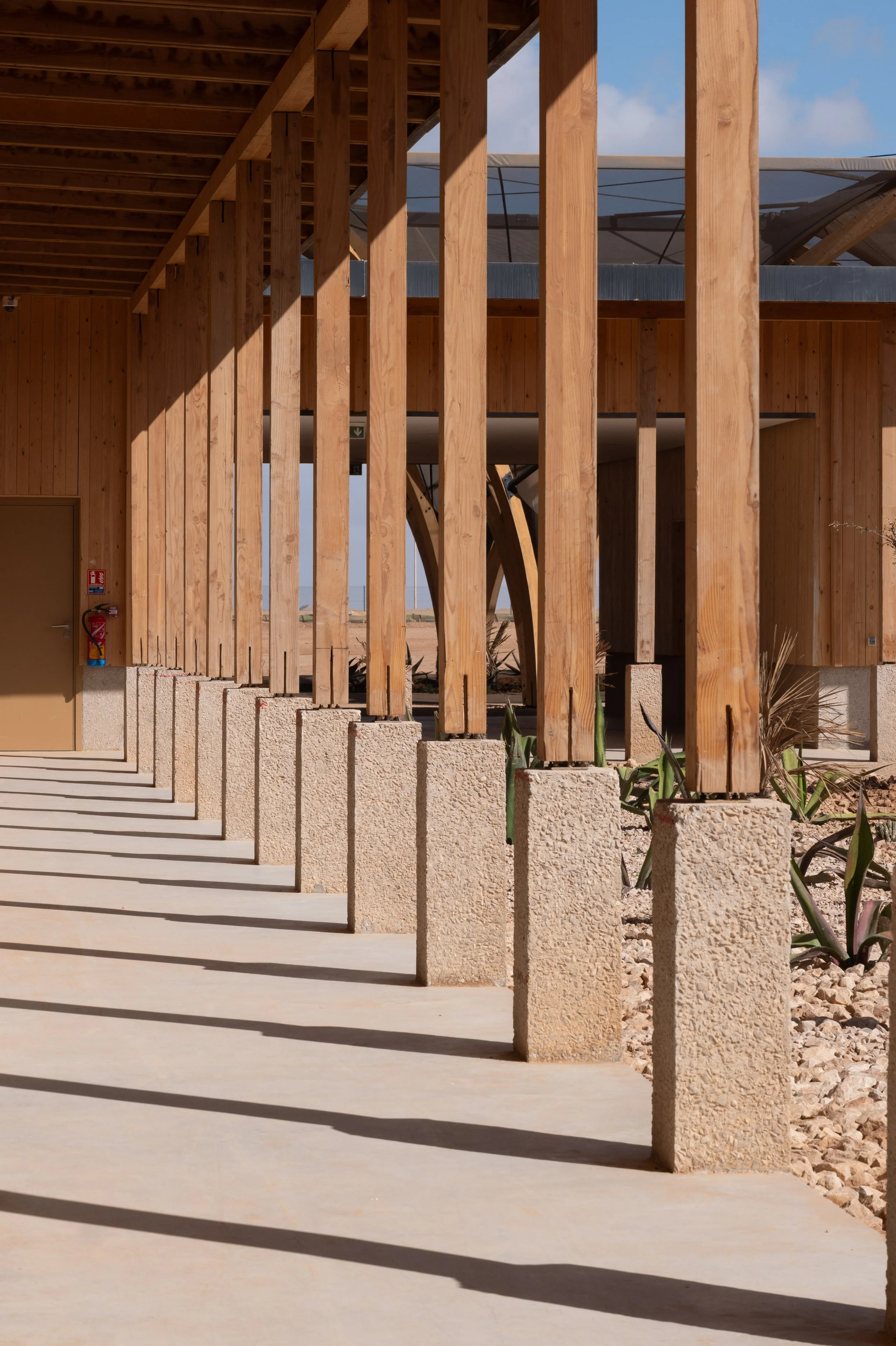 L’UM6P est constituée de quatre grandes entités programmatiques : l’administration, les salles de classes, les résidences et le restaurant universitaire, totalisant 12 500 m² net. Elles s’agglomèrent autour de patios - verdoyants d’essences locales et à l’abri des vents et de l’horizon - propices aux rencontres entre étudiants et professeurs. Ces différentes parties du projet sont reliées entre elles par une canopée, également héritée du projet du FMI, constituée d’arc en bois habillés de toiles perforées qui filtrent la lumière naturelle et distinguent un dedans d’un dehors dans ce grand paysage.