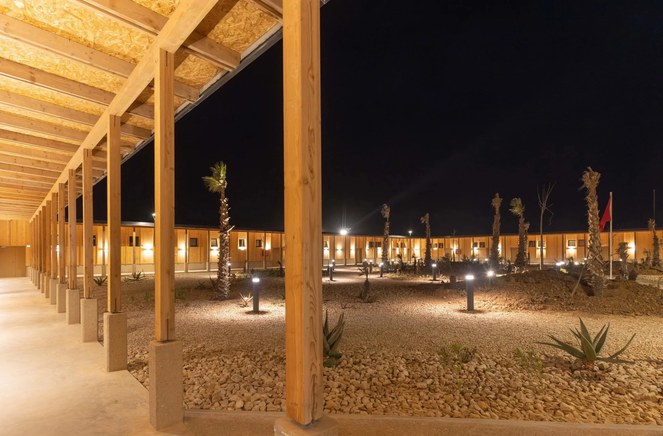 Dans un souci de développement durable et de rapidité de chantier, le projet de l’UM6P réutilise les modules en bois qui ont déjà servis au projet des Assemblées Annuelles du FMI à Marrakech, déployés pour l’occasion pendant quelques semaines.