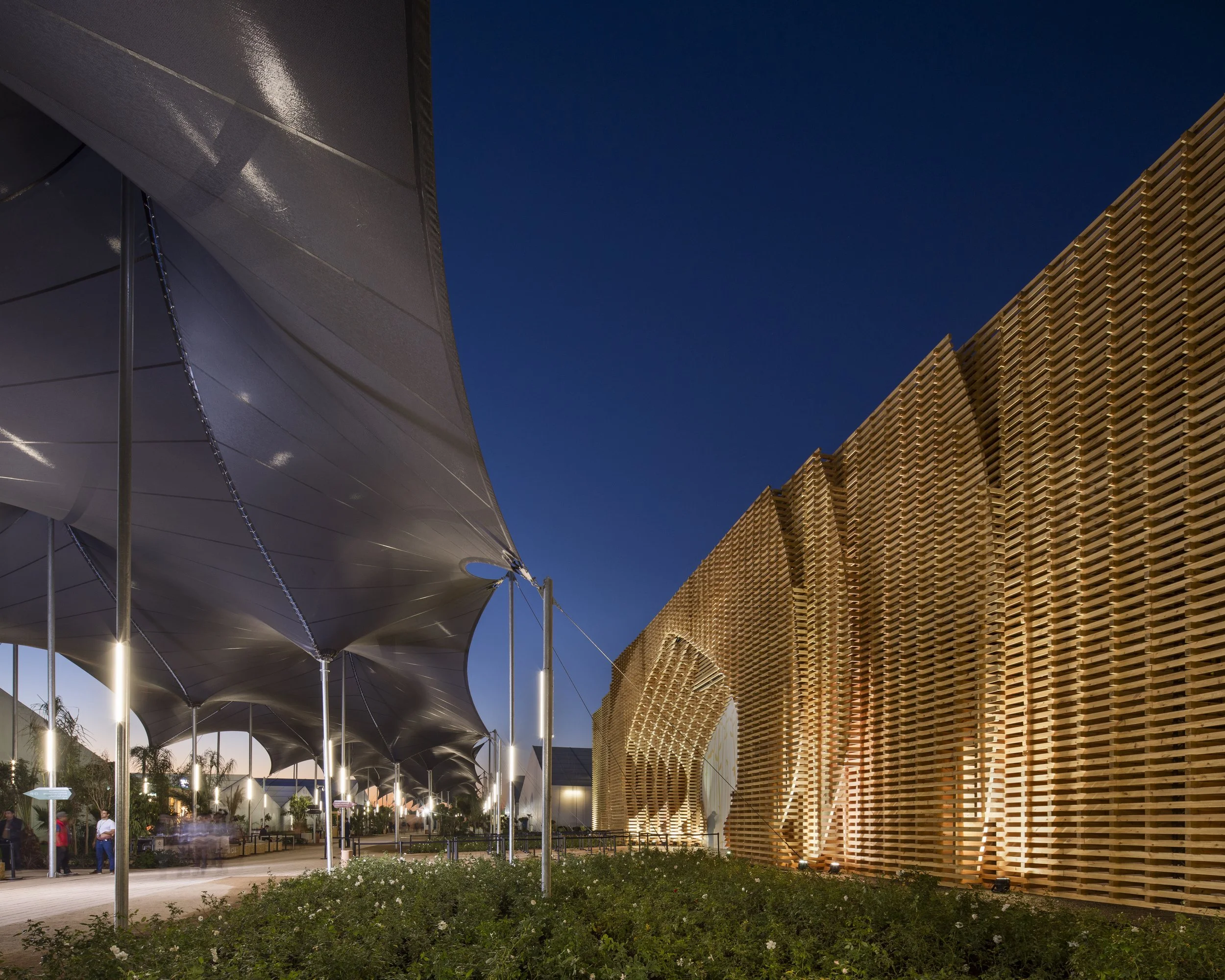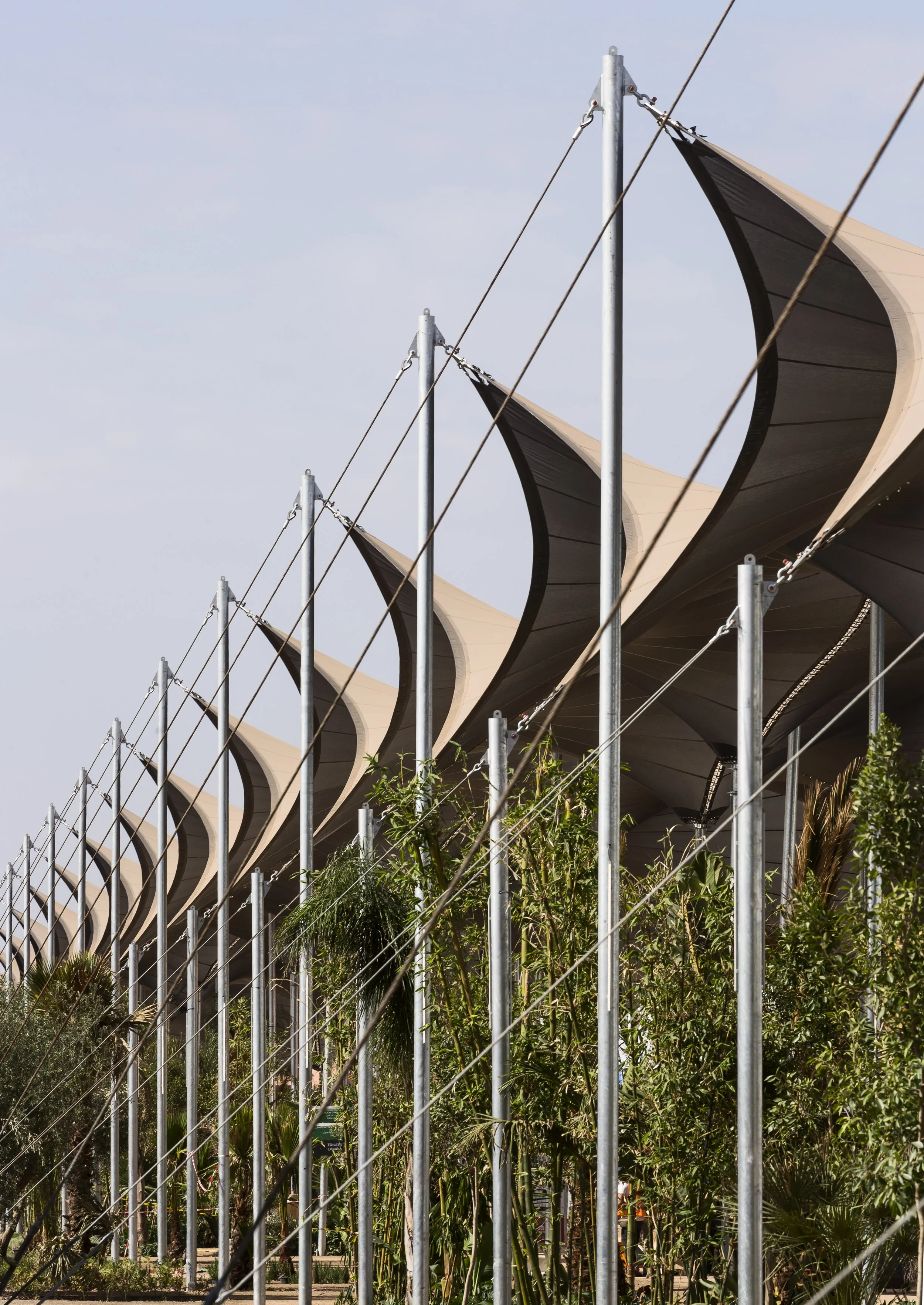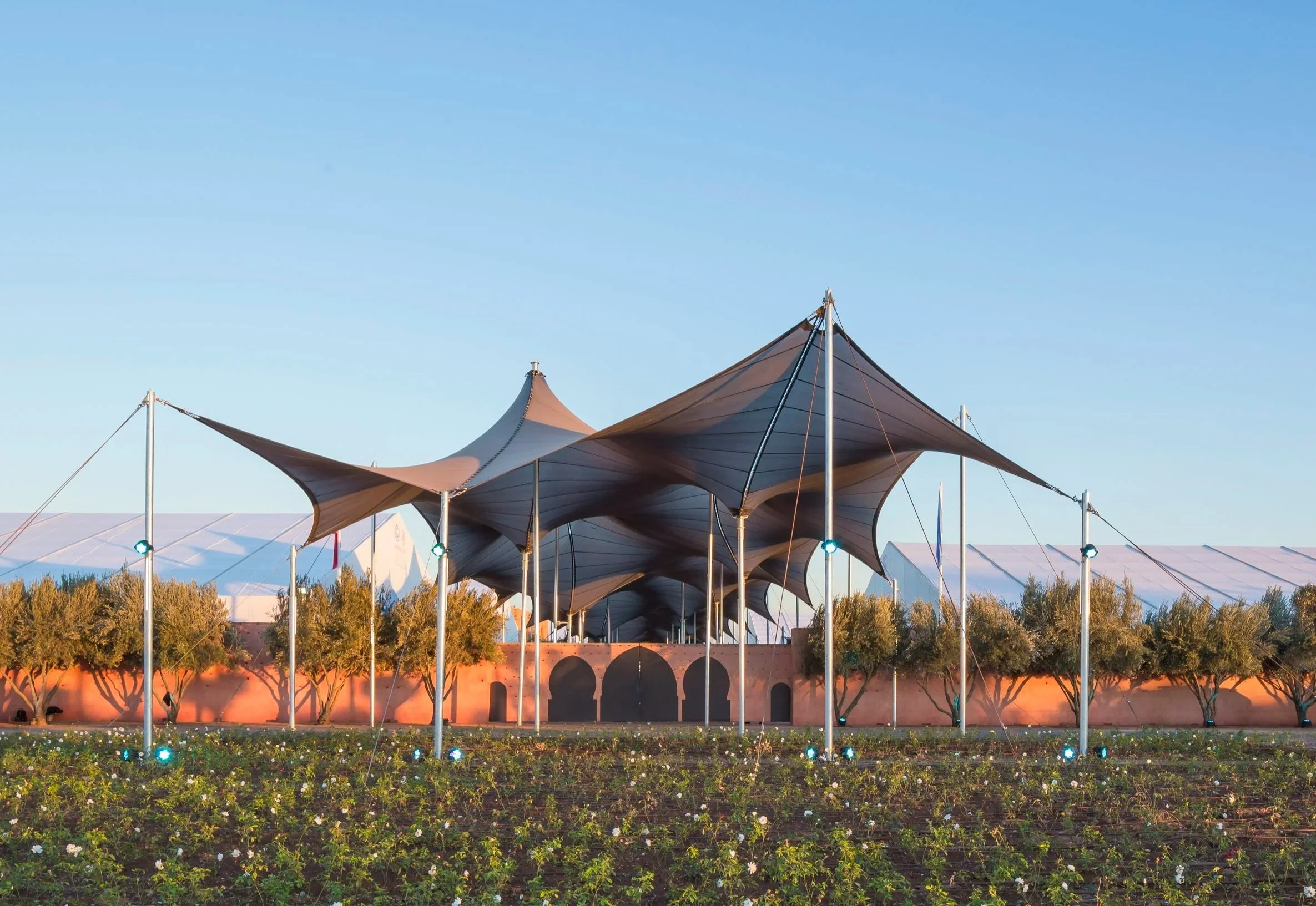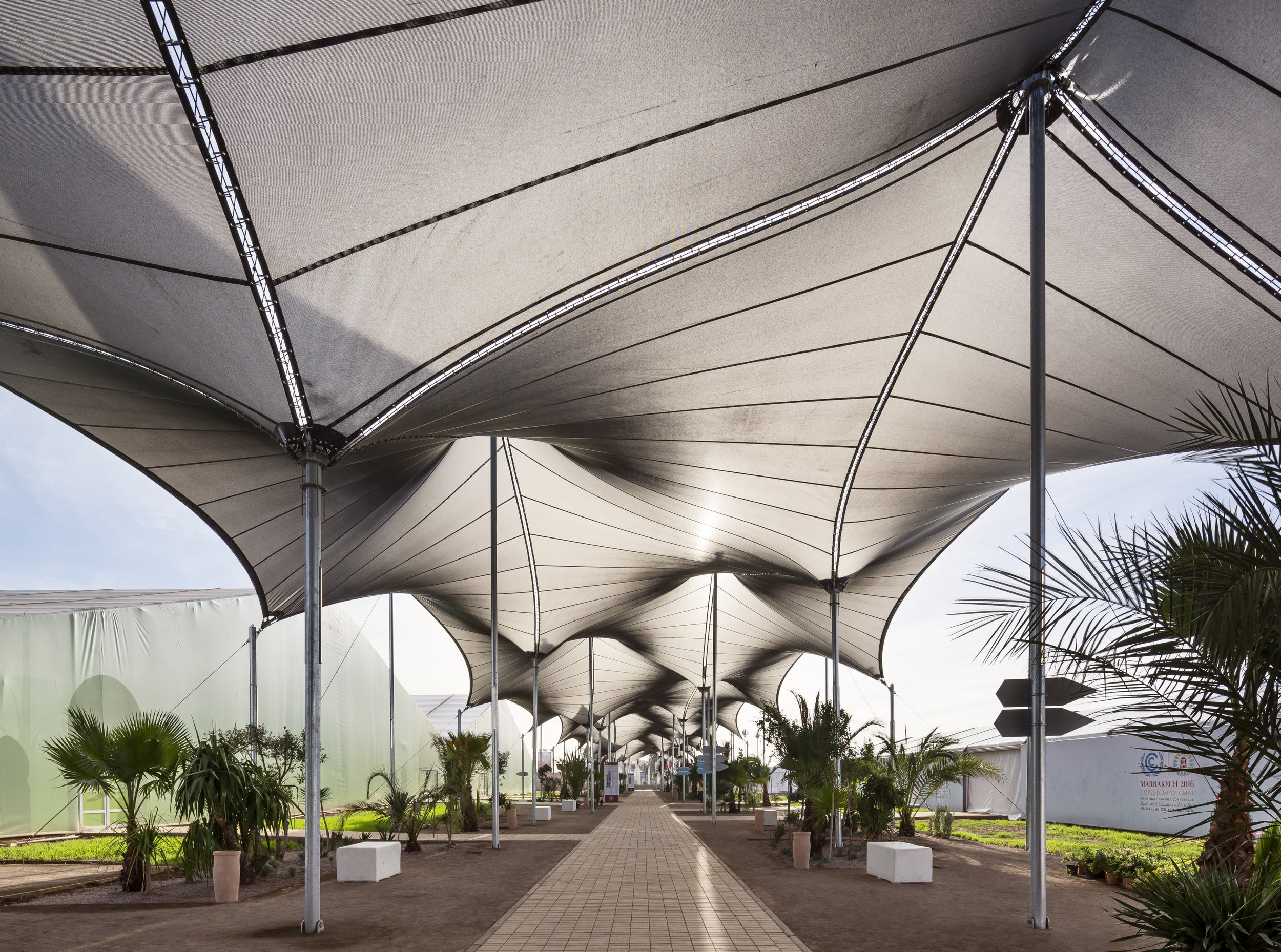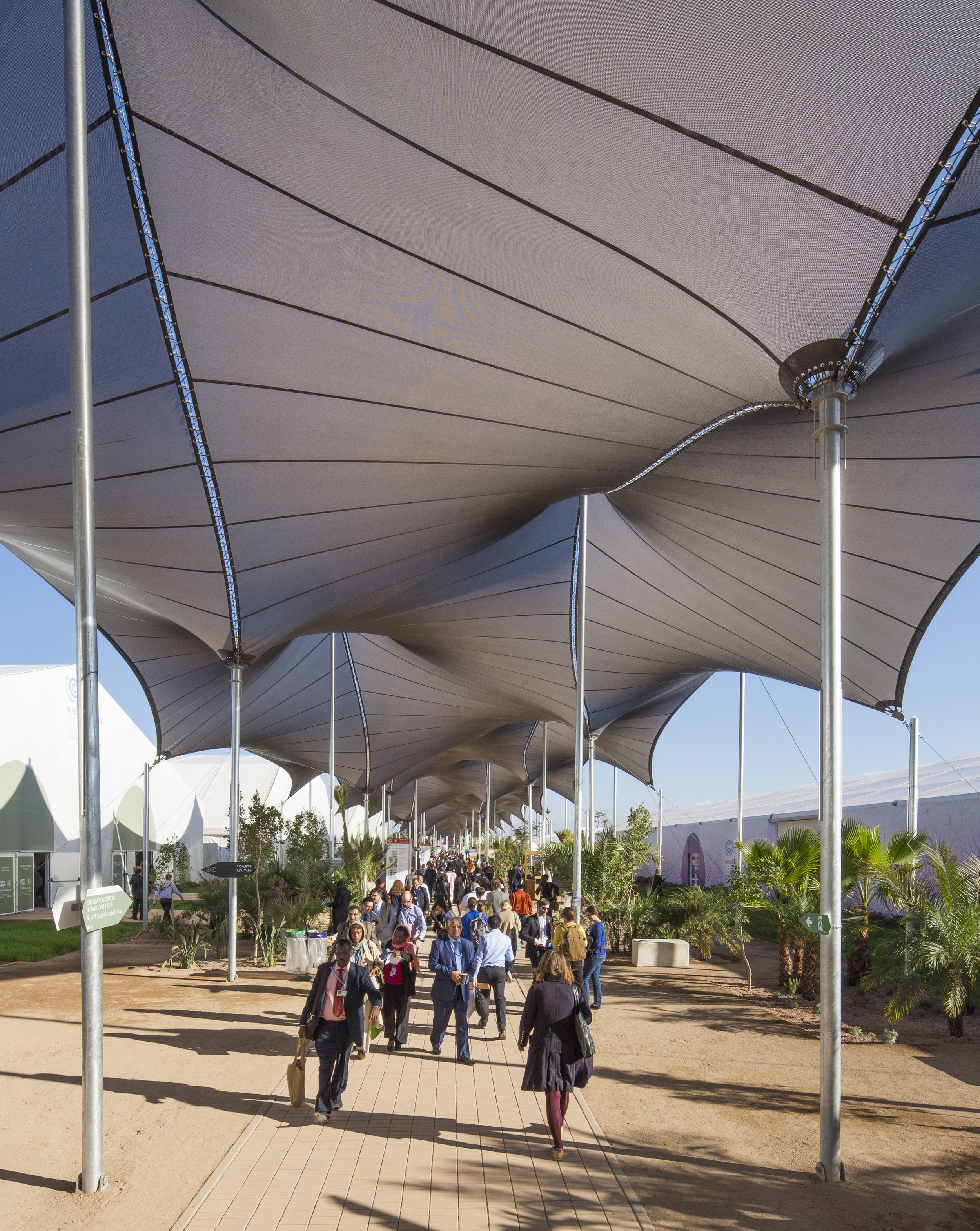Every year for the past twenty years, 40,000 delegates from 195 countries have met for the United Nations conference on climate change in order to address questions concerning the future of our planet. Inspired by the local festivals called "Moussems," large public gatherings of the region, often post-harvest, that hold cultural, social, economic, and religious significance for the community, the design of the exhibition grounds is based upon a temporary urbanism created by the installation of a series of reusable wooden structures and a village of canopies, entirely demountable and reusable. The tent is a primitive and universal form of architecture that speaks to the common needs of man on this planet.