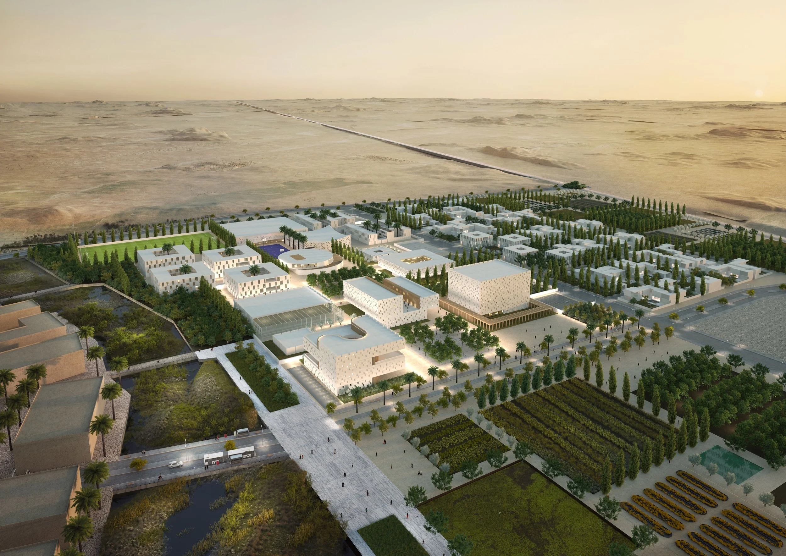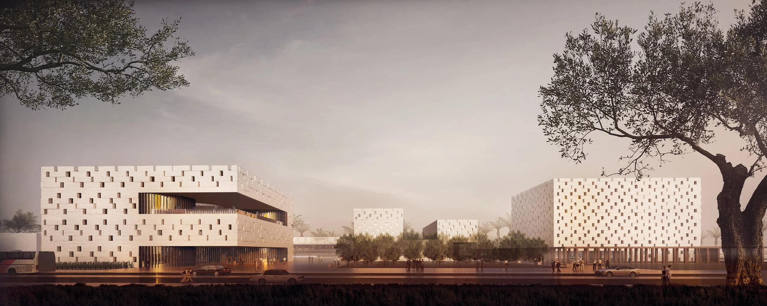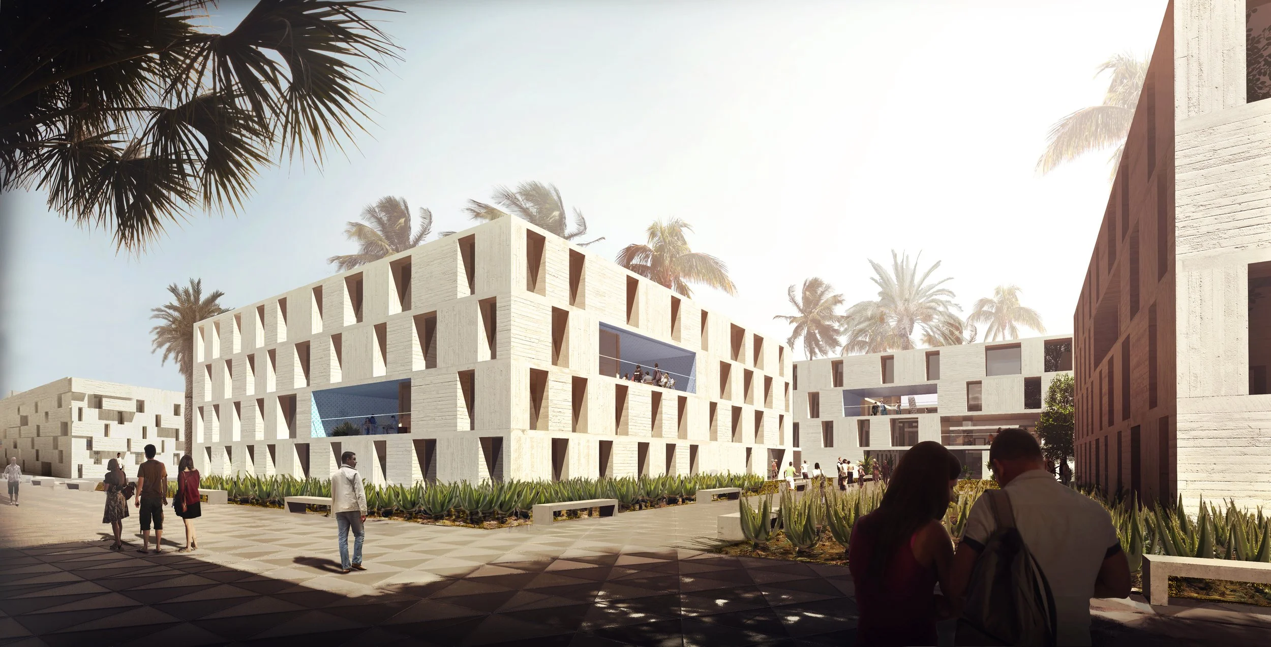 In the technopole of Foum El Oued, the 26-hectare university campus will account for nearly 20% of the entire area, which means that it will become the structuring element of the quality of the urban fabric. Beyond its scale, it is by its strategic positioning between marshes, wadis and dunes that the site will define the identity of the entire place. Rather than imitating the "constituted city" in this site with a powerful natural heritage, we wanted it to be precisely the scale of the landscape that structures the territory. Here, in order to fit in with the university's scientific and technical project, we have organized the project in an agrarian framework that will weave together all the elements, full and empty, built and landscaped.