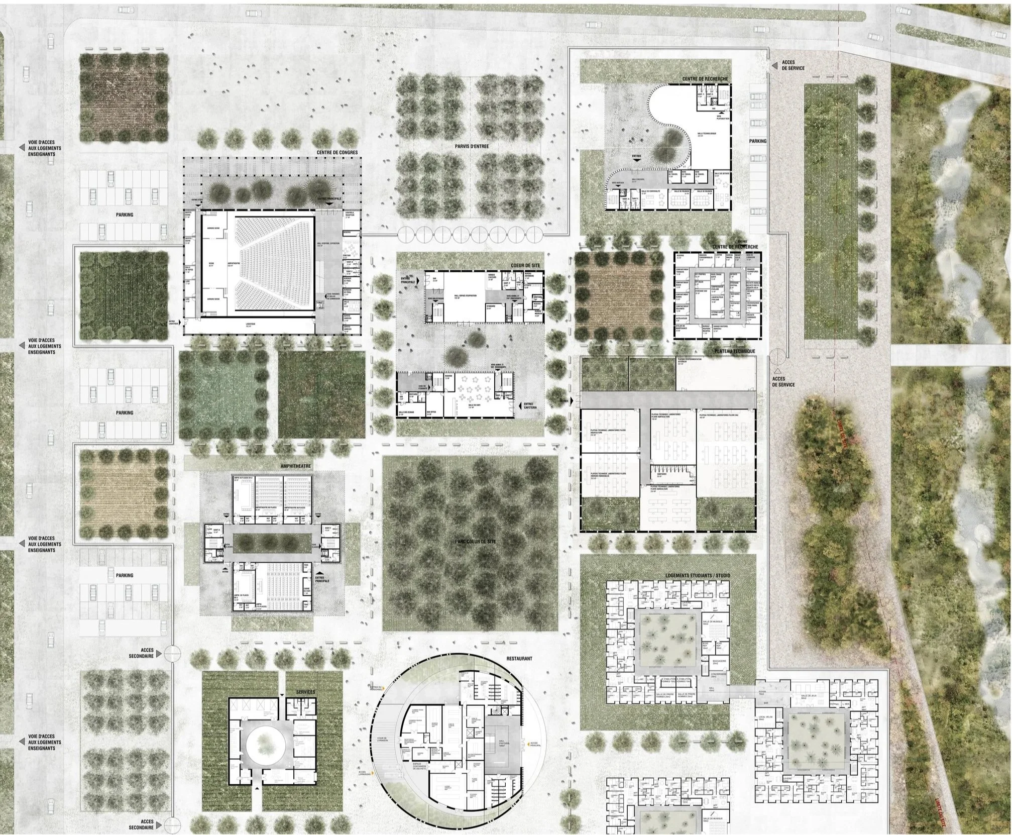 Agrarian framework: This new "urban structure" crosses the roadway and allows the three parts of the site to be woven together. On the west side we decided not to build in this first phase of the university's life, to allow the most compact organization possible and to offer even more land possibilities to the experimental part, which becomes an urban landscape for the whole project.