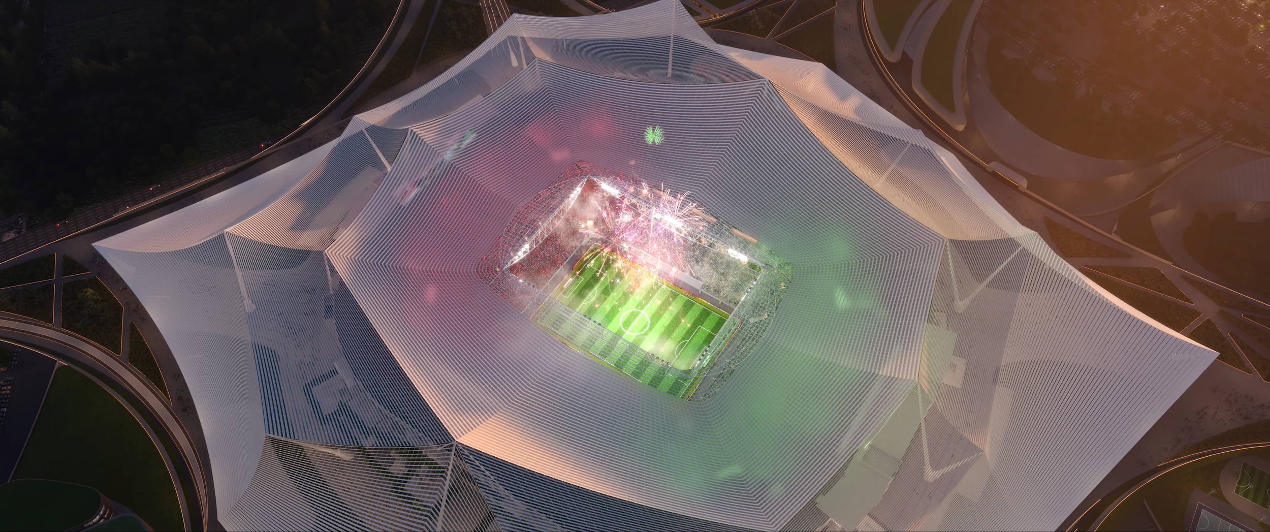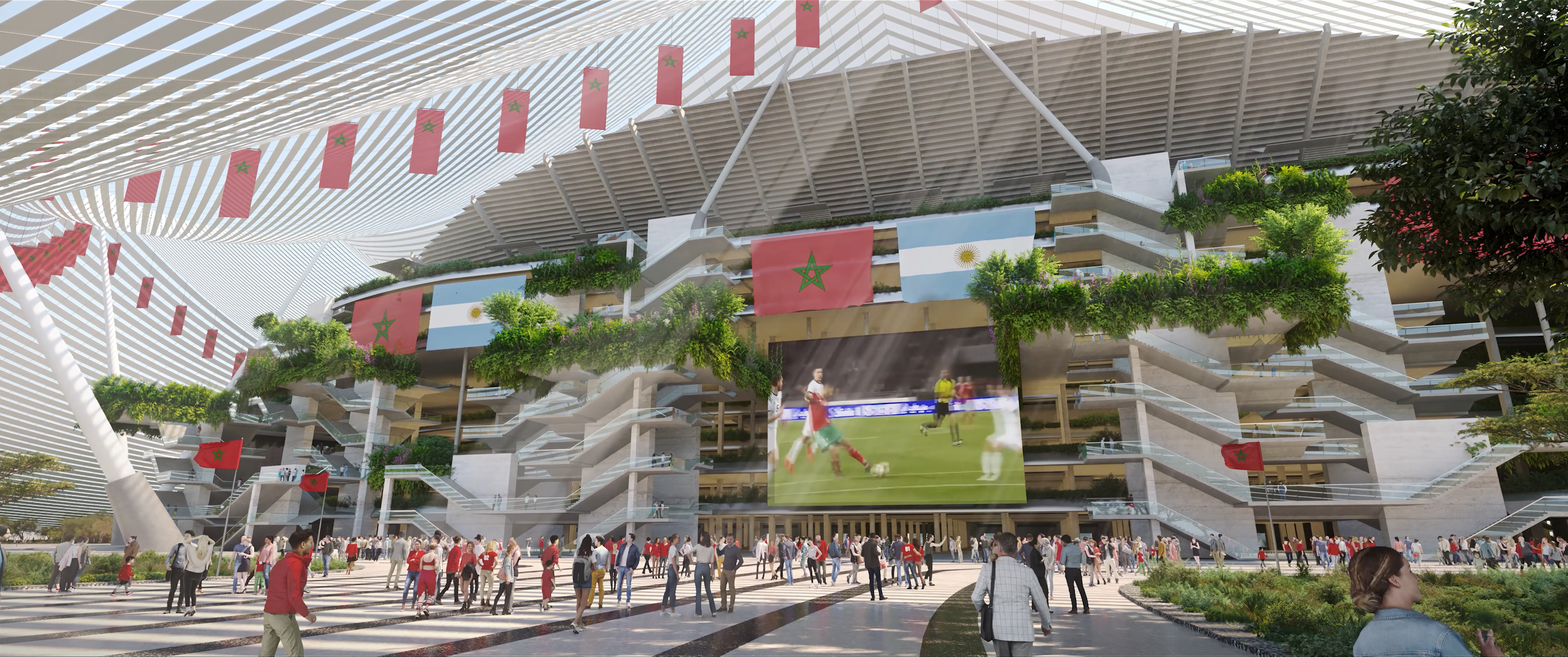 A vast, lightweight tent, unfurled toward the sky, covers the entire stadium and its surroundings, creating a spectacular landmark within the landscape. Made from a network of cables supporting aluminum sunshades, the tent is held up by a ring of 32 stair towers, forming monumental porticoes that support the grand concourse. At ground level, beneath the tent, a multitude of acclimatization gardens and activity spaces complete this natural atmosphere.