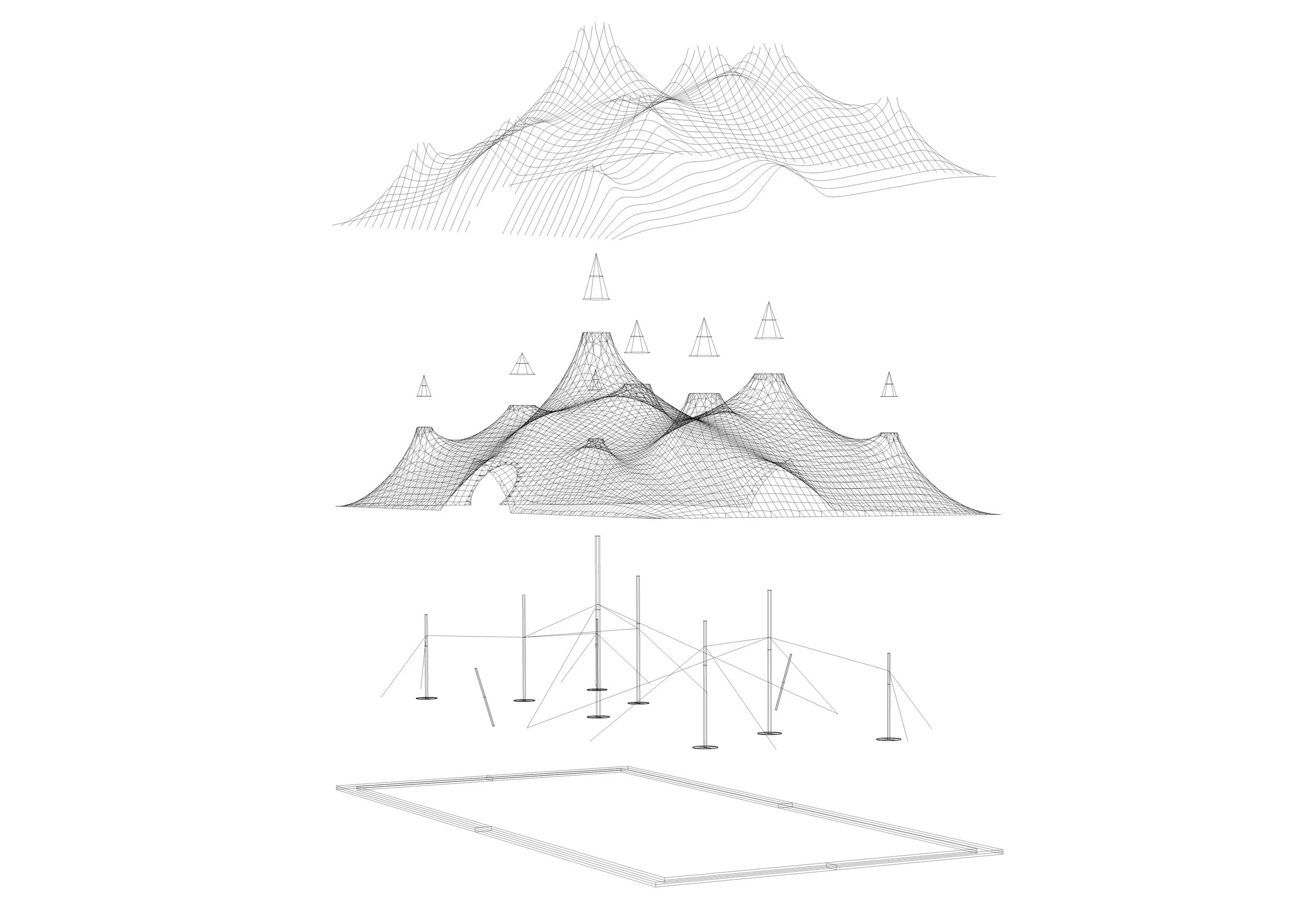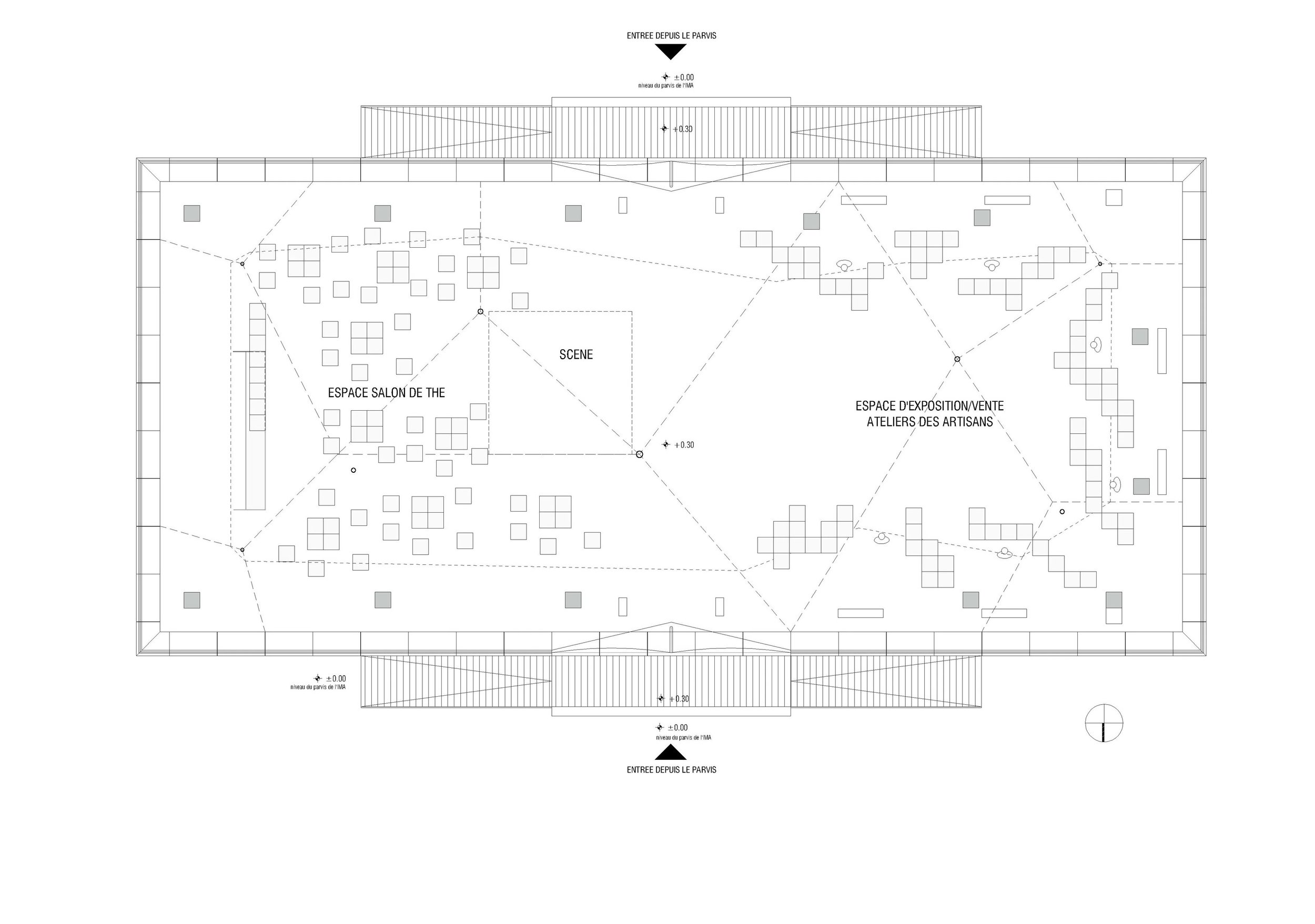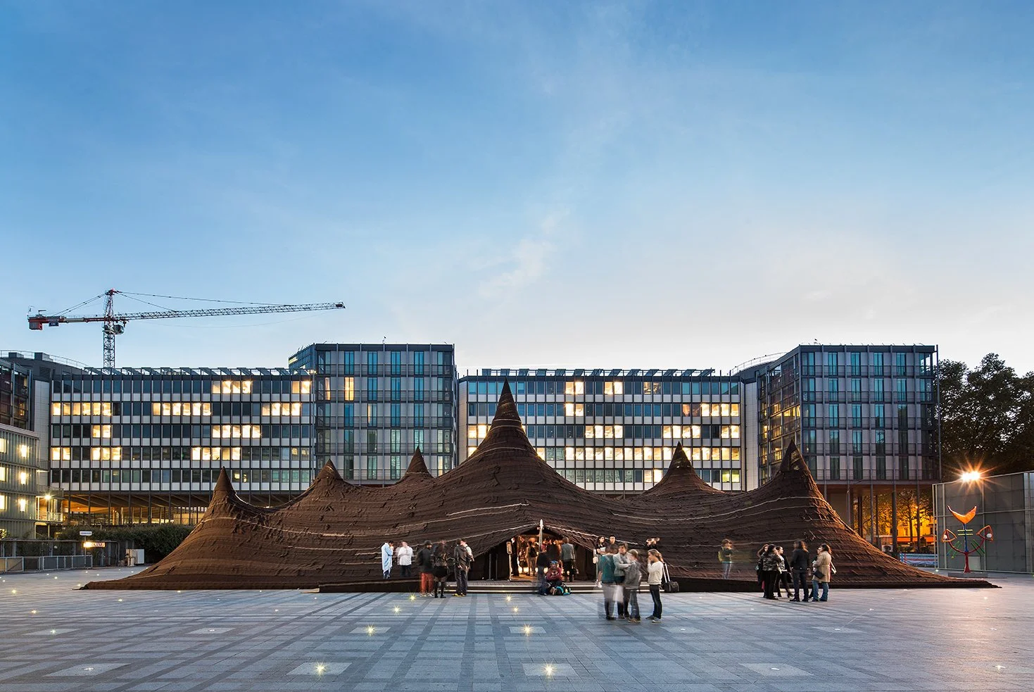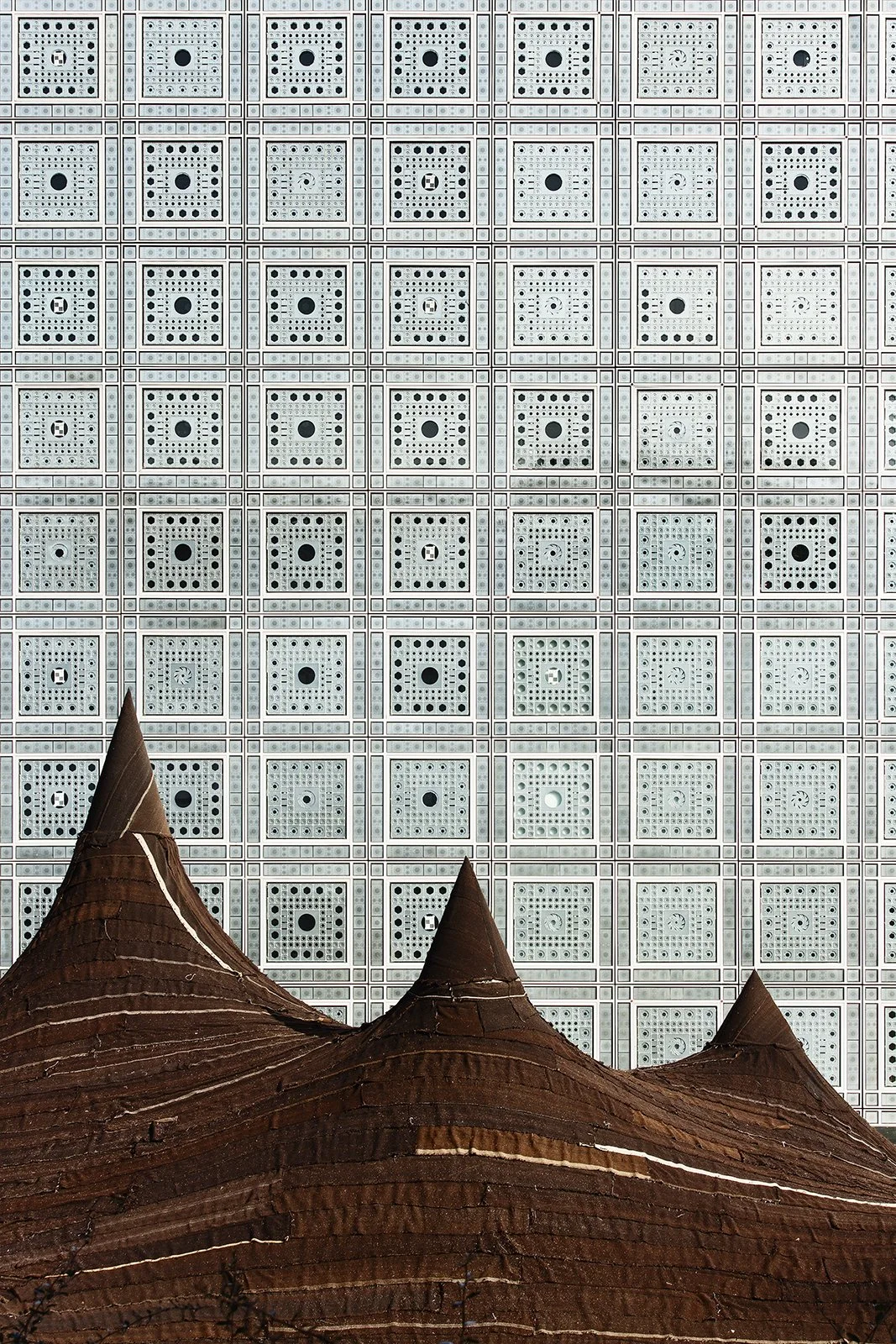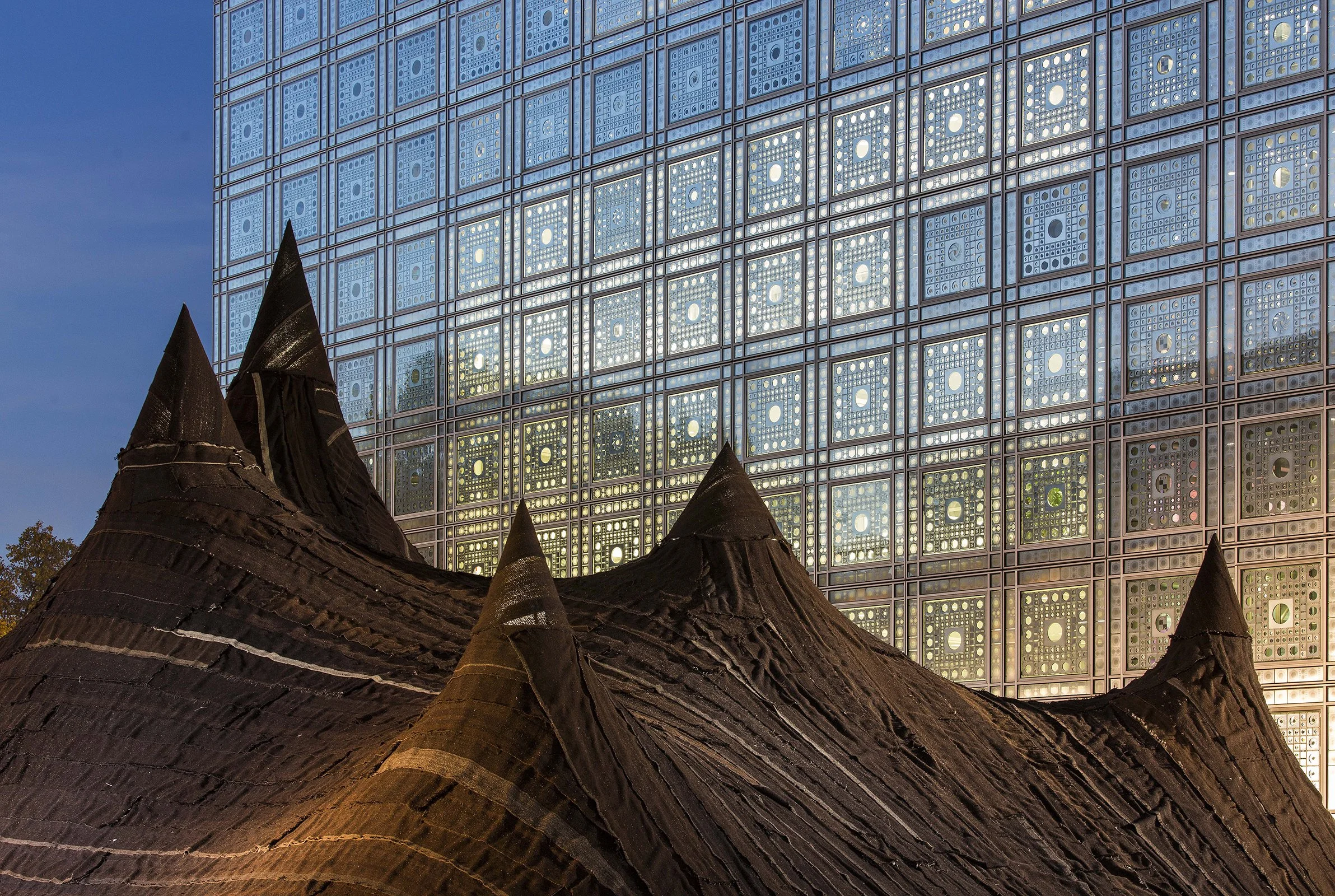 In conjunction with the "Contemporary Morocco" exhibit ("Le Maroc Contemporain") at the Institut du Monde Arabe in Paris, a giant tent was constructed on the plaza in front of the building. Constructed from more than 650 m² of camel and goat wool woven by female cooperatives in the Saharan desert, the tent serves as an urban landmark and a symbol for the “Contemporary Morocco” exhibit. The tent harmonizes contemporary design and technical innovation with traditional fabrication methods. The rhythm and scale of the tent’s silhouette renders a topographic dimension to the structure which pays homage to the nomadic traditions of southern Morocco. Within the tent, the installation features the work of master artisans from Morocco. The tent also houses a café, a boutique showcasing Moroccan handicrafts, and a performance space which hosts various events throughout the duration of the exhibit.
