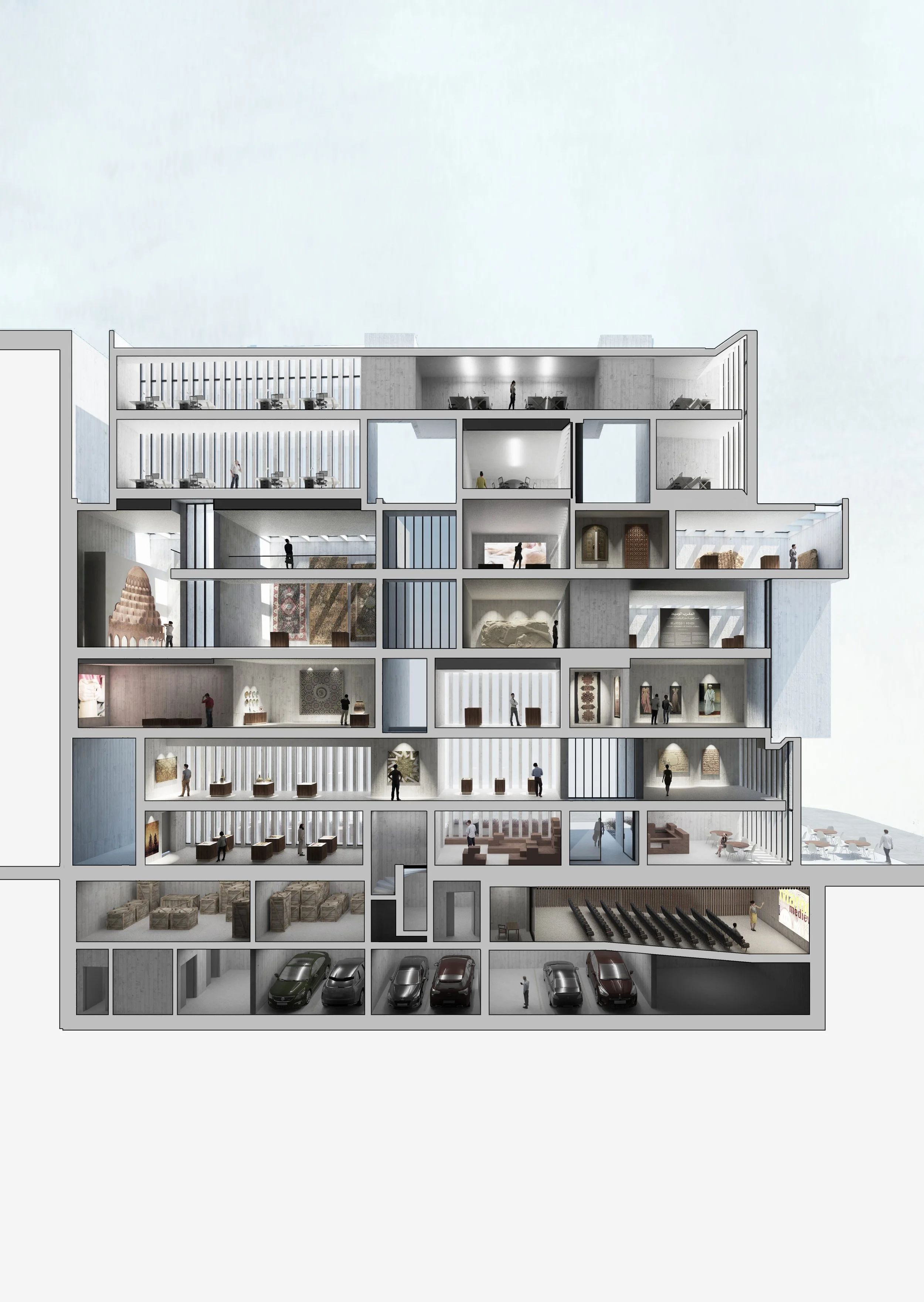 The Dr. Leïla Mezian Foundation Museum is composed of an articulation of volumes which creates a rich urban landscape. The volumes interconnect to create porosities in the continuity of the urban façade, bringing light and a visual connection with the city deep within the museum. The collection, which focuses on traditional arts, continuously dialogues with the realities of the contemporary world. The exhibition is composed of three components: a permanent collection of traditional arts, a gallery dedicated to the works of the painter Meriem Mezian, and a temporary exhibition space. The volumetric play between parts to whole achieves both a continuity for the museum and a flexibility that addresses the different spatial needs of each of these museum entities.