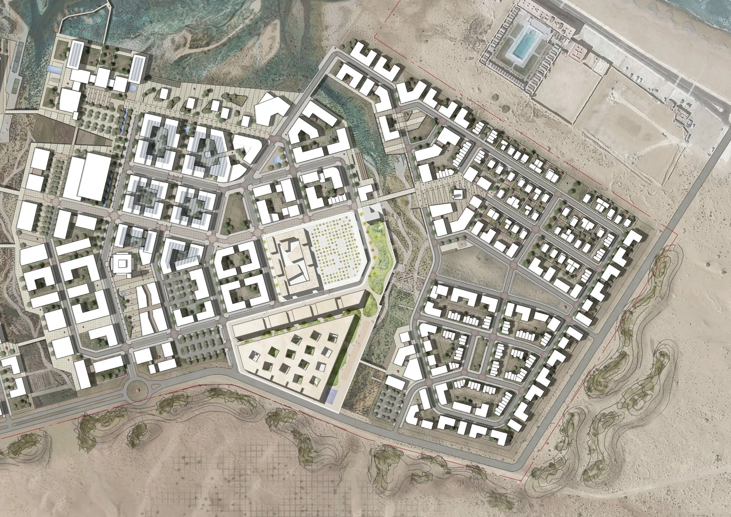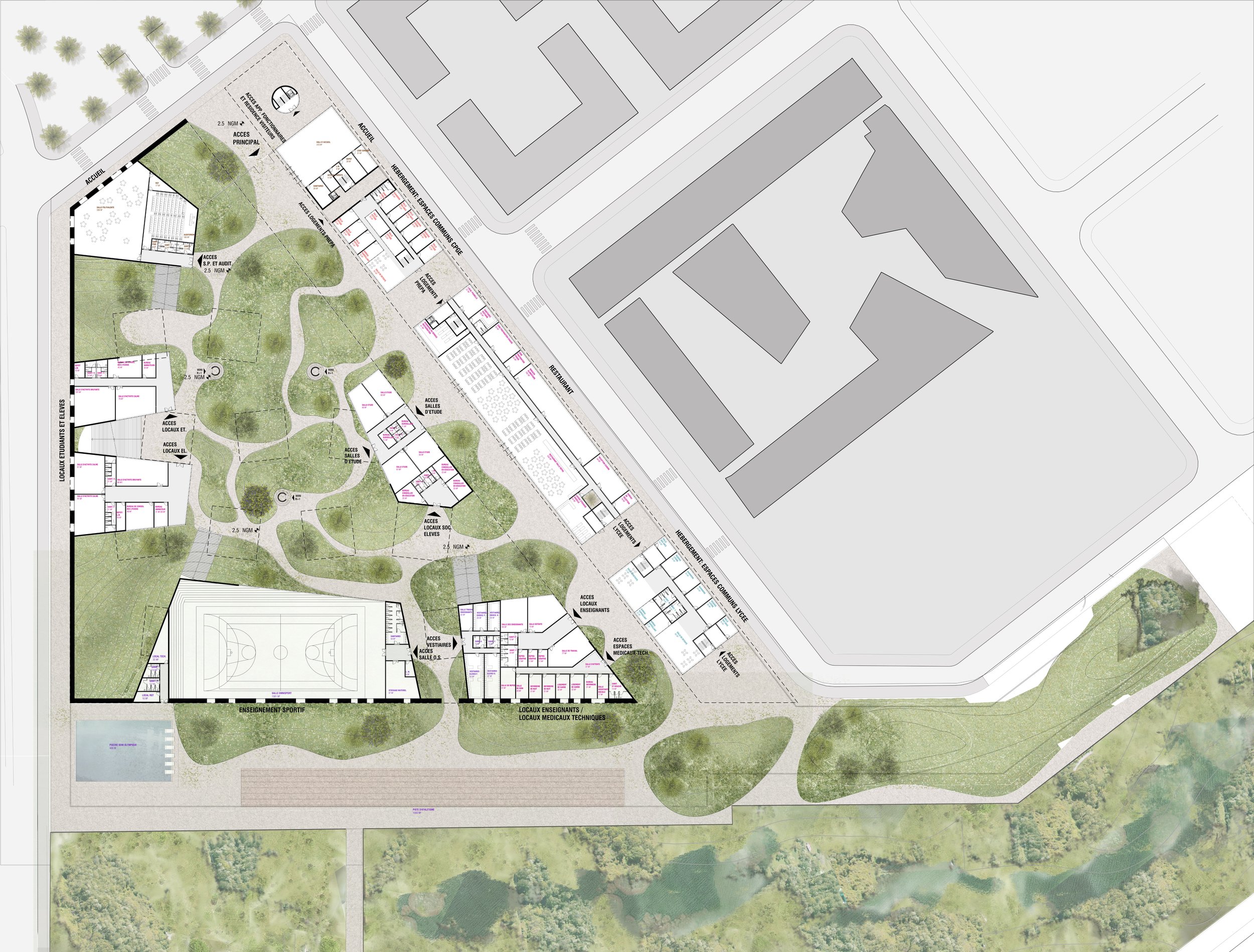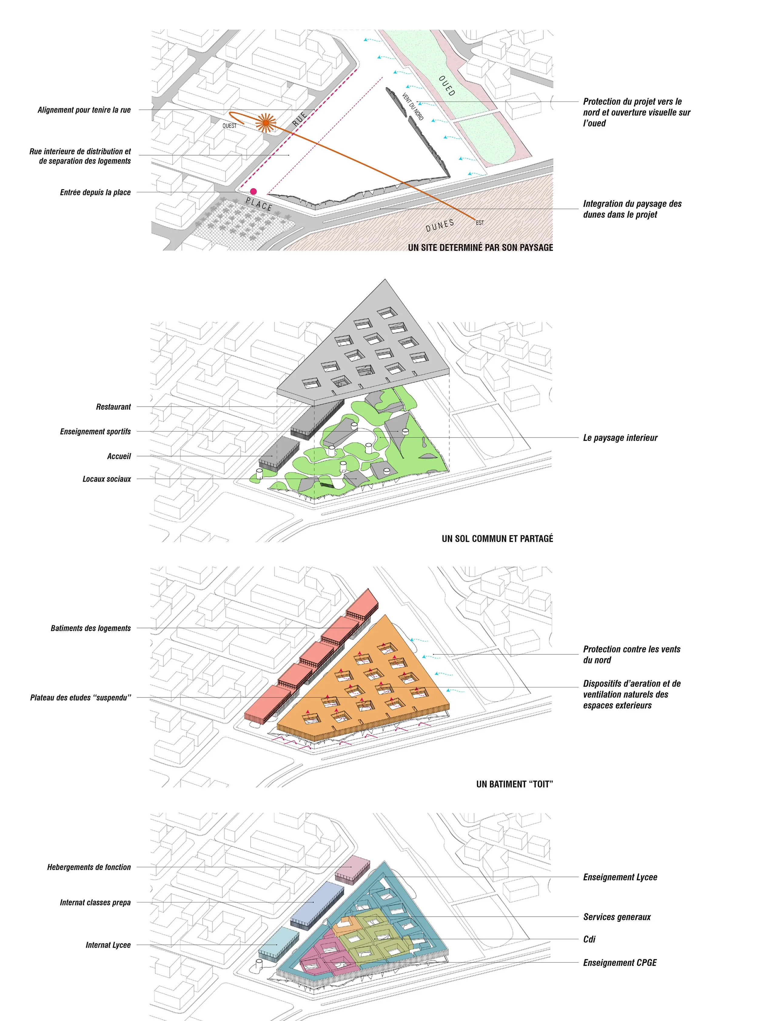Construire un lycée dans le désert, à la lisière d’un fleuve asséché sur un territoire encore vierge d’urbanisation, a été l’occasion d’explorer des formes extrêmes d’habitabilité. Le bâtiment est un « toit », une plaque suspendue à dix mètres du sol, qui fabrique et protège un nouveau paysage. Sur ce dernier, on retrouve l’ensemble des espaces publics et communs, tandis que la plaque surélevée abrite les espaces pédagogiques. Ici l’architecture est pionnière et protectrice, primitive et radicale. Elle protège le paysage et les usages, elle rend possible ce nouvel établissement territorial. Entre infrastructure et superstructure, l’échelle du bâtiment n’a d’autre repère que le paysage.