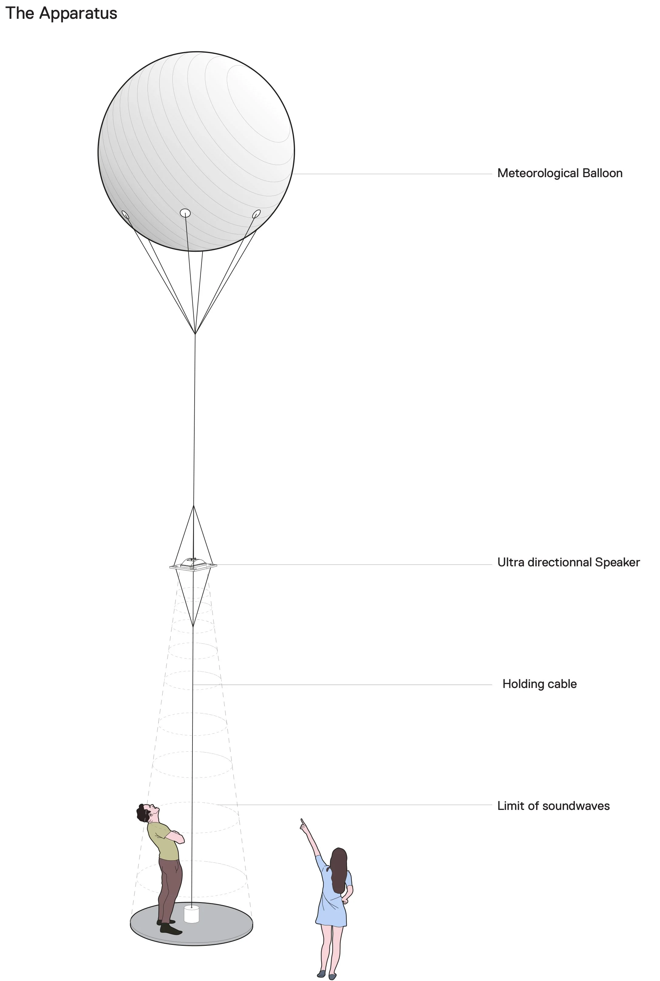 Each balloon is equipped with a unique sound system—a directional sound wave that carries the voices from the crypt. Together, these voices form a soft murmur, a subtle republican chorus, like a whispered conversation gently filling the space. However, directly beneath each balloon, the voice and speech become clear and intelligible—but only for one person, the one standing directly below. The idea is not to have these great men proclaim grand speeches, but rather to have them speak personally to each of us, in a private and almost intimate way.