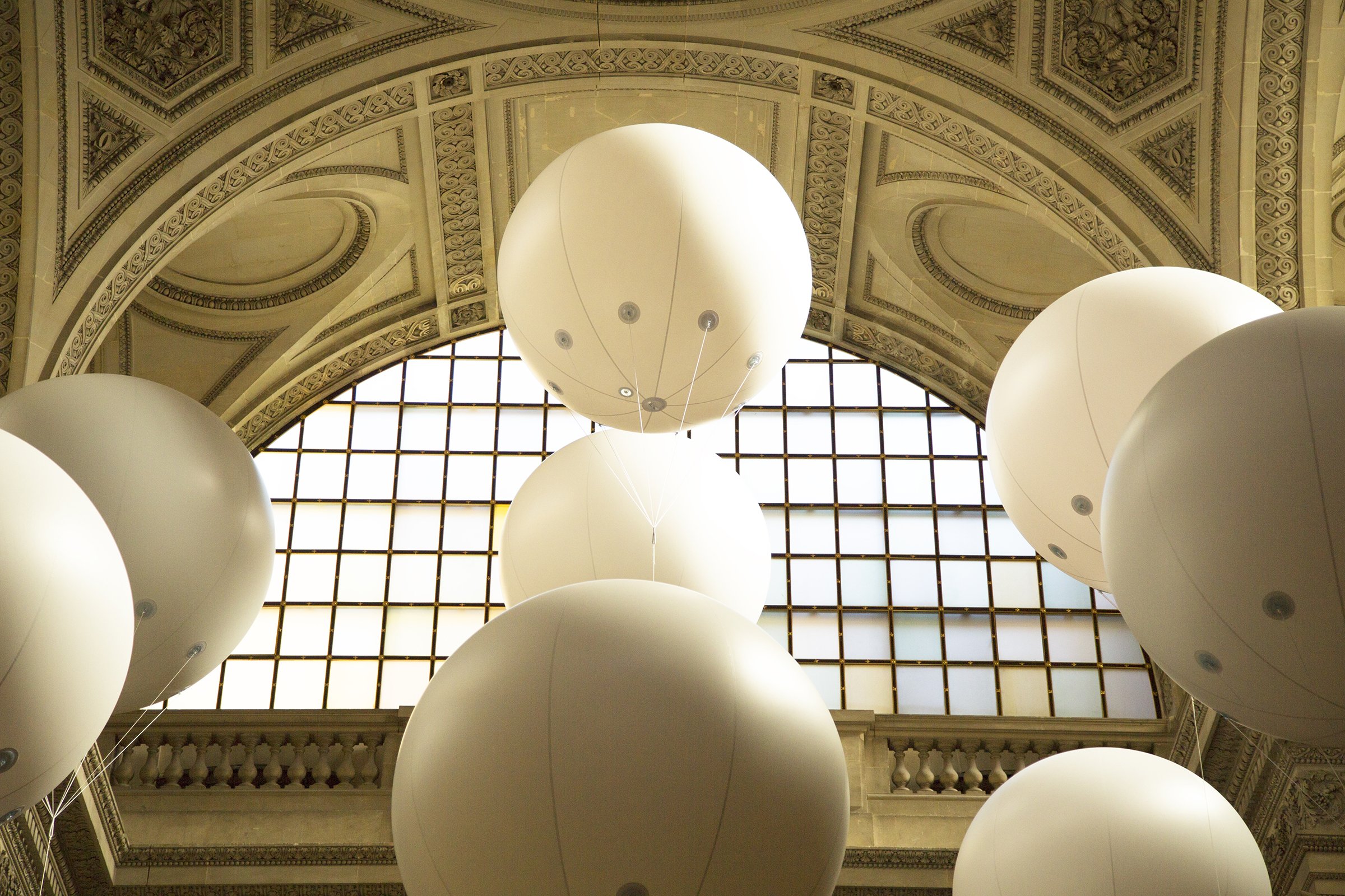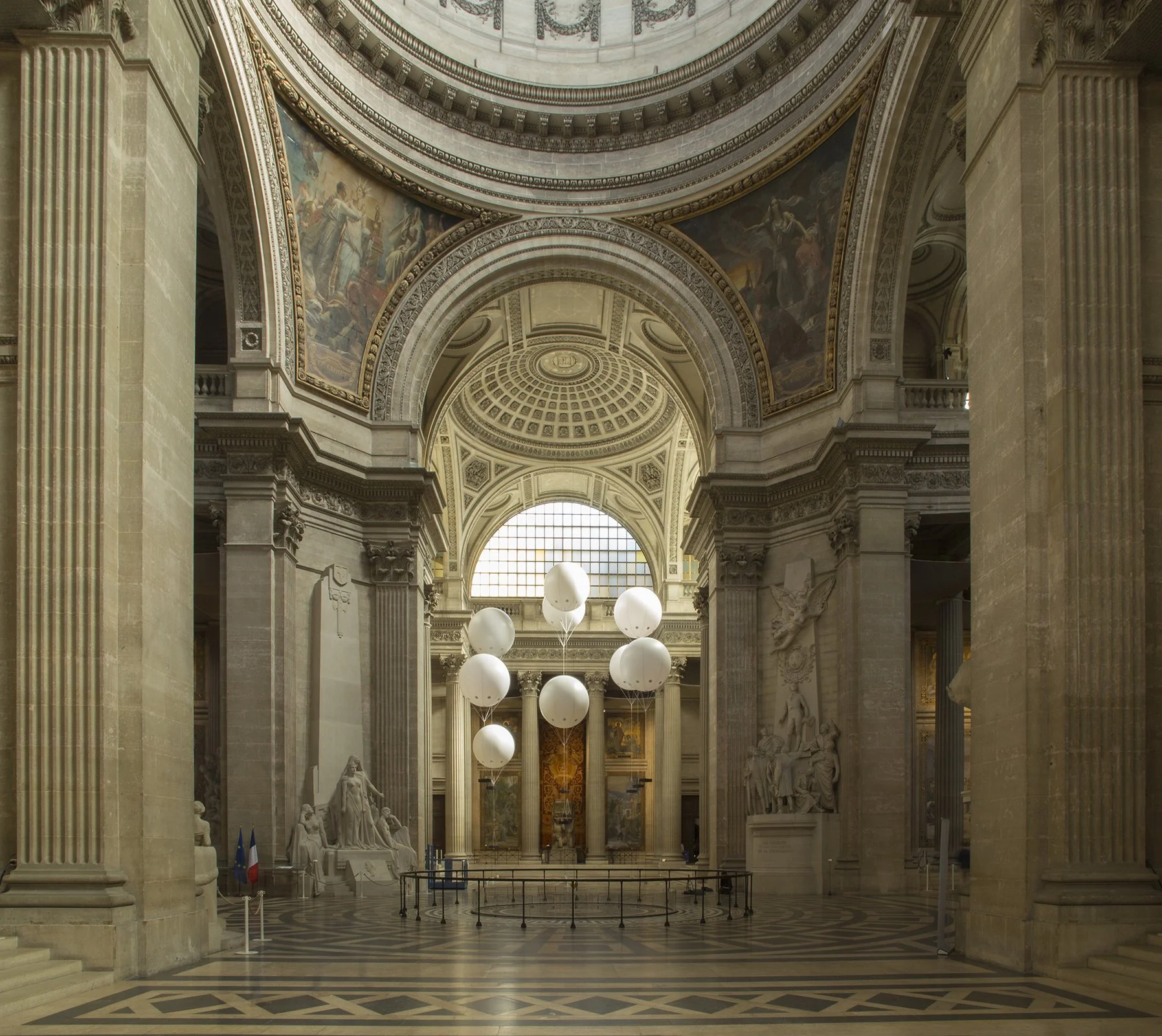 Twelve enormous balloons, each 2.5 meters in diameter, will float throughout the height of the Panthéon, engaging in dialogue with the impressive volume of the space. In contrast to Foucault’s pendulum hanging from the dome, these balloons are anchored to maintain a fixed position.