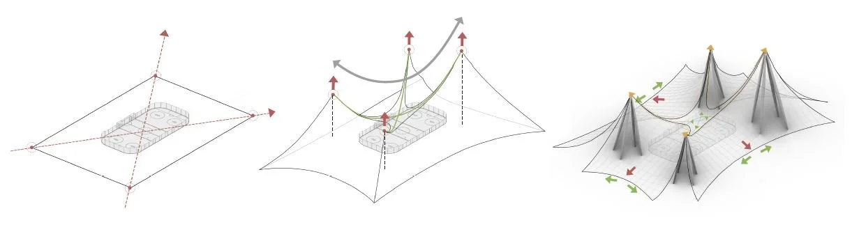 La tente bédouine exprime une simplicité de forme, un usage économique des matériaux, et une richesse d’ambiance visuelle intérieure. Cette expression régionale s’accorde parfaitement avec le lieu. L’intention première de ce site est de proposer un espace de rassemblement communautaire, qui ne se limite pas à l’équipement sportif intérieur, mais agit aussi comme un cadeau au cœur de cette vallée, un point de convergence emblématique. La croissance littérale du projet à partir du paysage vise à tirer son espace et sa qualité du parc urbain — un parc conçu pour accueillir tous types d’événements.
