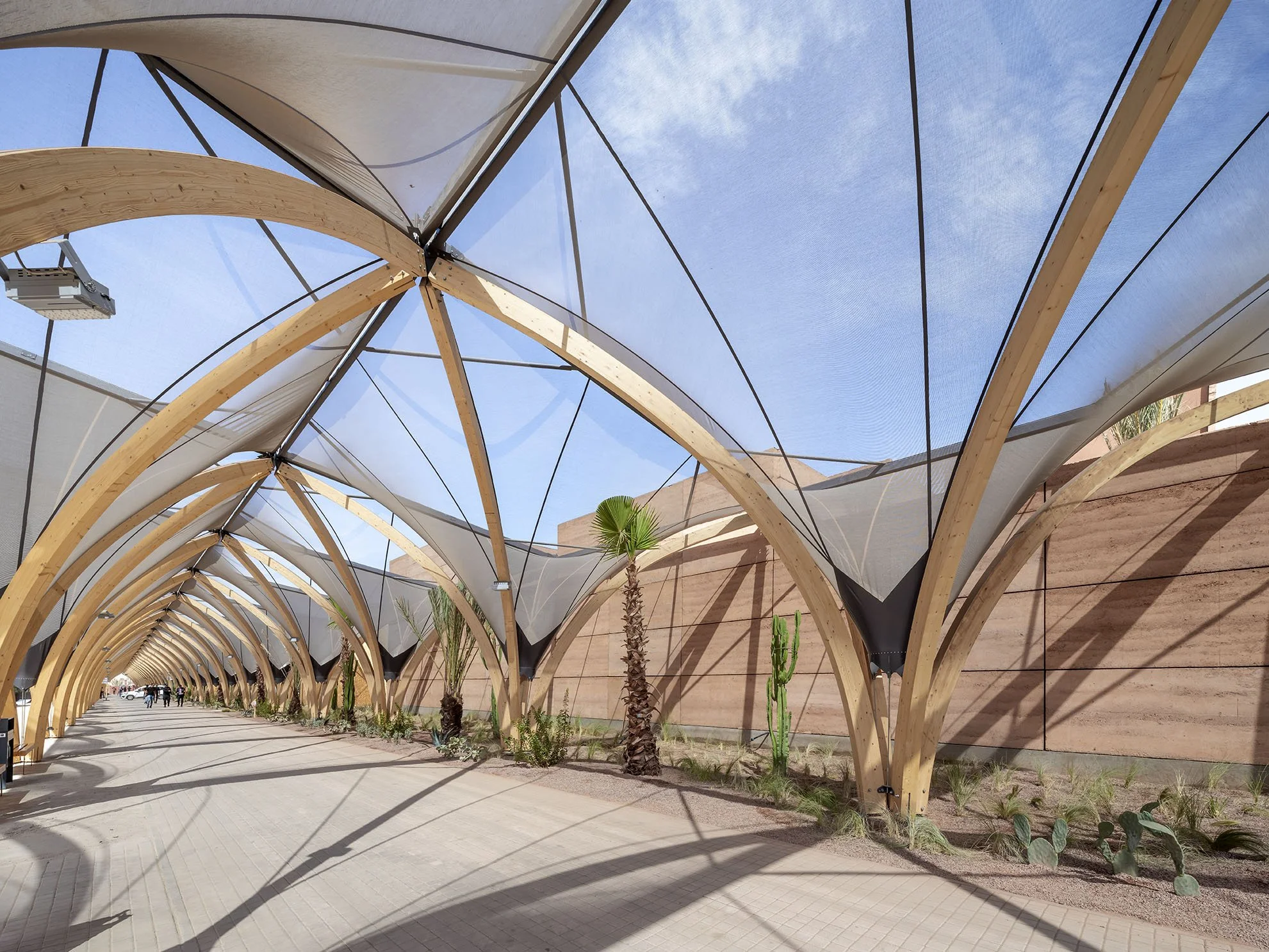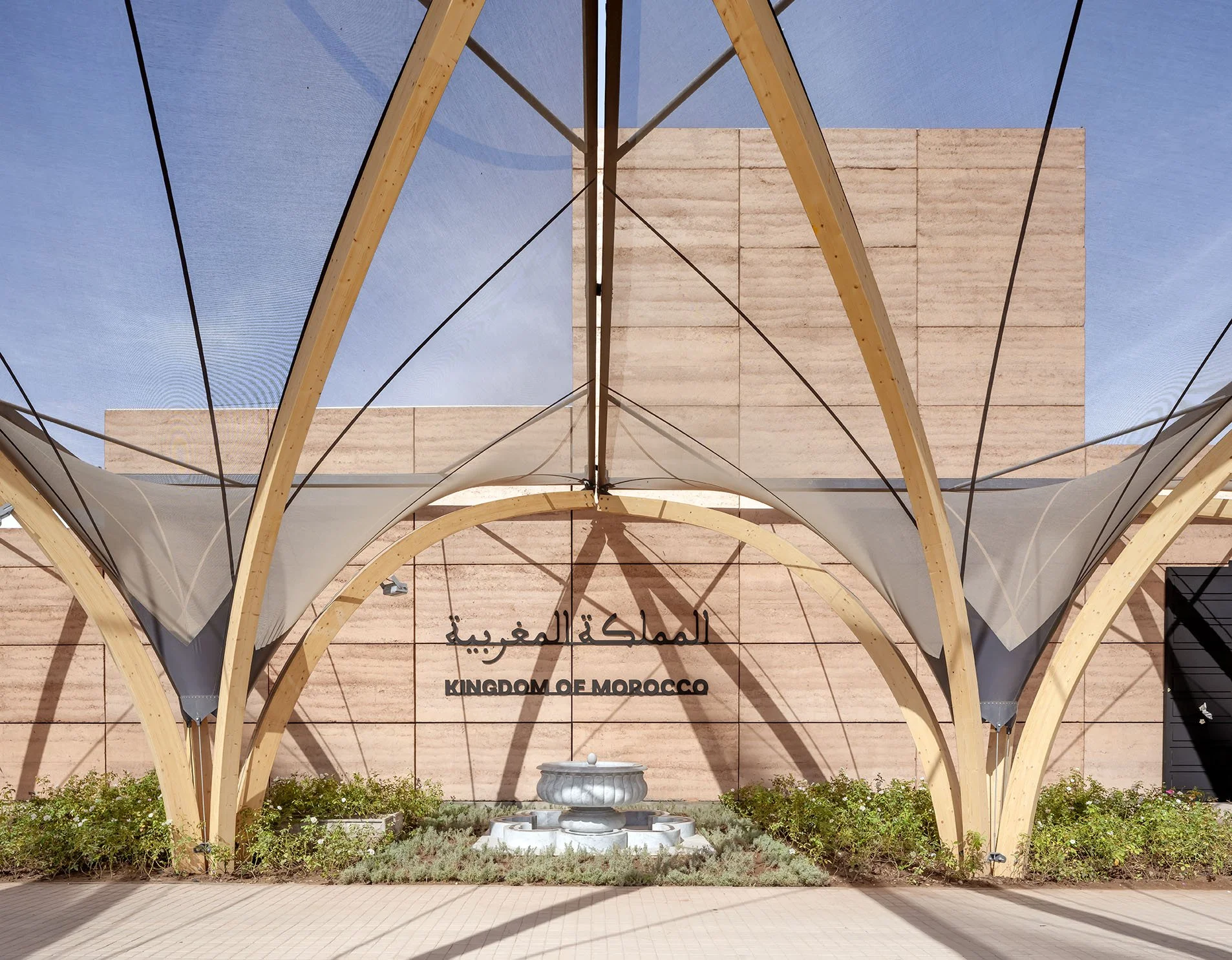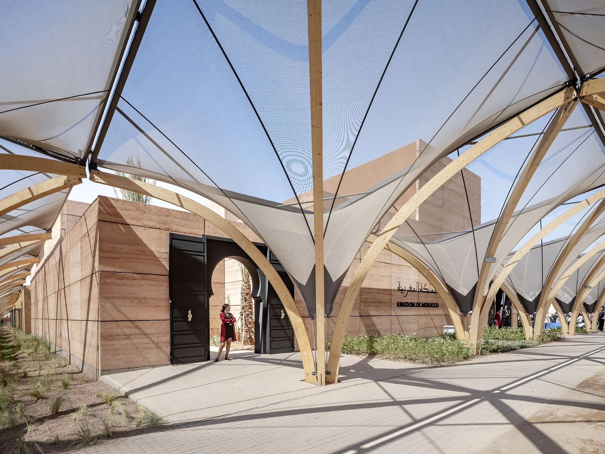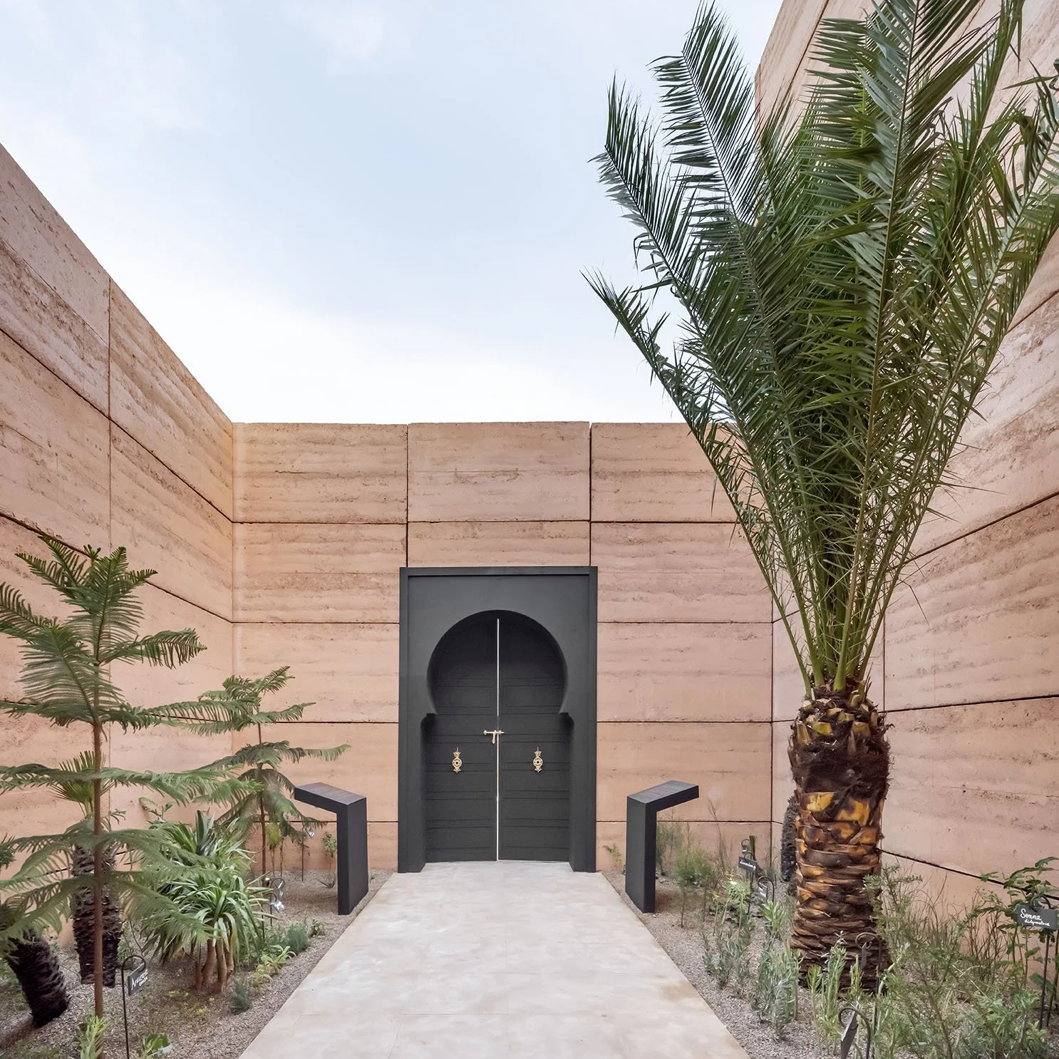 Au cœur du campus des Assises de la banque mondiale et du FMI s’installe un petit écrin, le pavillon du pays hôte. Nous voulions que la découverte de la civilisation se vive plutôt qu’elle ne se montre, qu’elle soit une expérience sensorielle puissante. Ce petit objet est construit en terre, celle de Marrakech, mais dans une mise en œuvre contemporaine en plaques préfabriquées. C’est un labyrinthe, une déambulation qui commence par un jardin, trouve un jardin dans son cœur et se termine par un autre jardin. Ces espaces extérieurs sont des systèmes écologiques miniatures, qui reprennent la diversité de la géographie depuis le nord méditerranéen jusqu’aux déserts du Grand Sud.