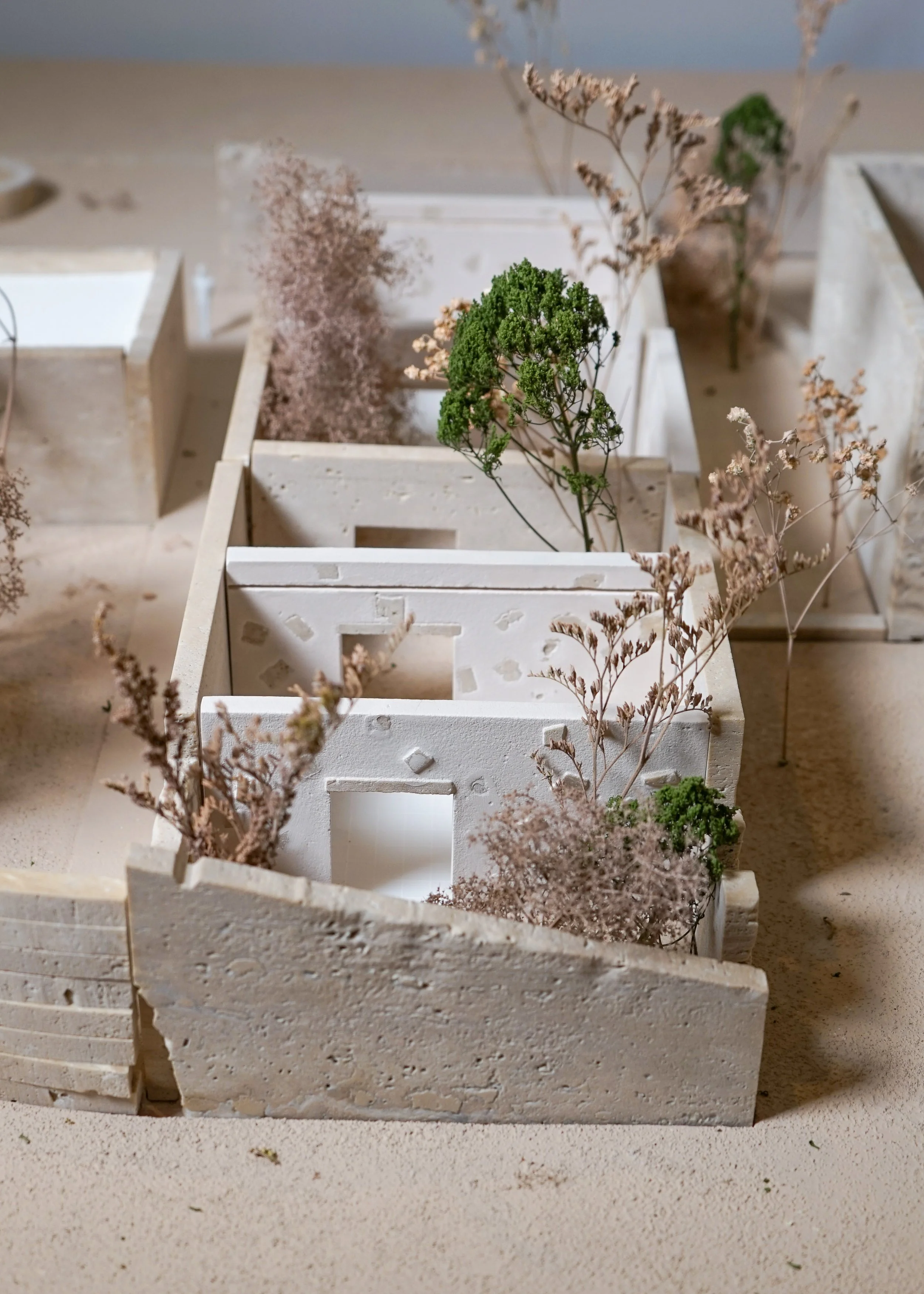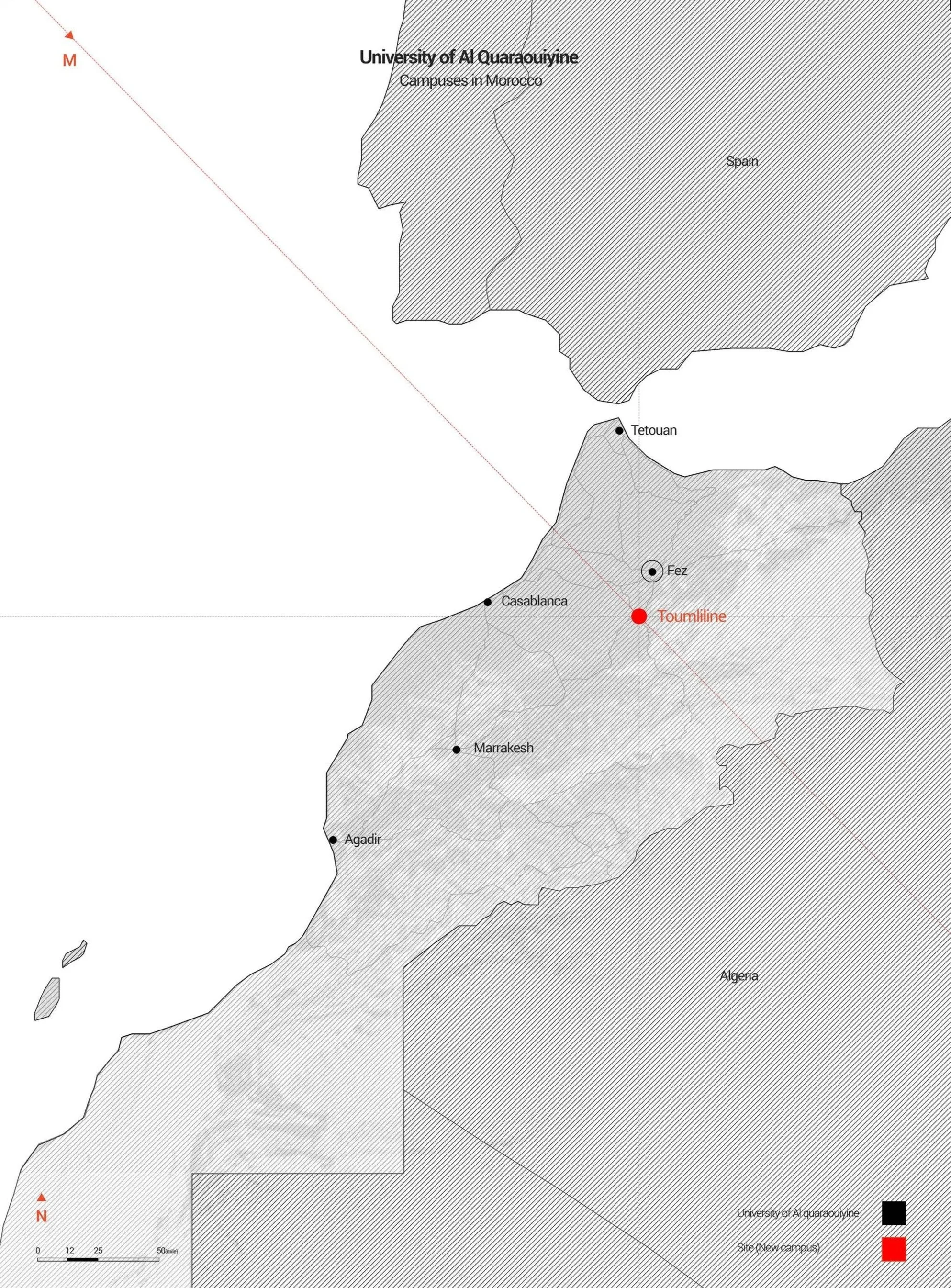 The objective of the graduate studio “Off-Campus”, taught by O+C’s principals and founders Linna Choi and Tarik Oualalou, was to reactivate and transform the site of the abandoned monastery at Toumliline into an experimental campus of learning and cultural exchange. Students were asked to imagine a new center at Toumliline that would serve as a ‘mirror campus’ to Fez’s Al-Quaraouiyine University, the oldest existing and operating university in the world and a leading center for education in the Muslim world. Disconnected from the urban fabric, the new campus was required to be a self-sustaining territory: dimensioned according to available resources, and integrated into a circular economy. Given the rural context of the site, students were also encouraged to experiment with local building materials found on-site, with a focus on new methods of earth construction discussed with specialists and researchers both at MIT and in Morocco.