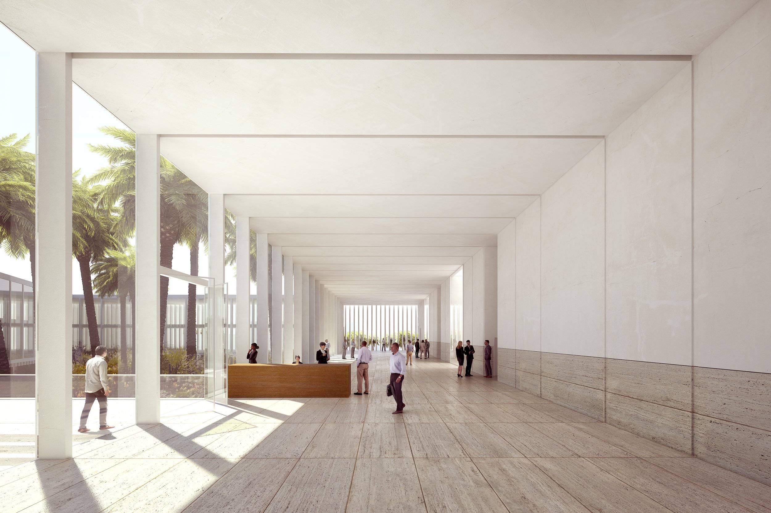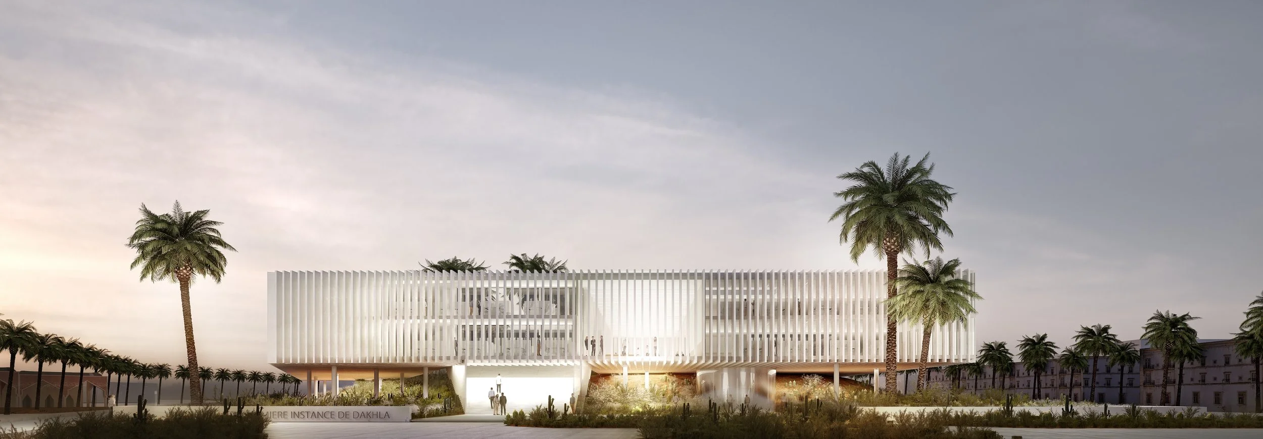 Institutional buildings can cultivate public goodwill by creating atmospheres amenable and friendly to the user. This project for the coastal city of Dakhla endeavors to render a judicial building as welcoming to the public as possible. The building is lifted from its ground in order to allow the landscape to pass under and through the building, suspending the building over the street. The courthouse’s presence on the street is softened by the presence of this garden. A floating staircase invites visitors up through the hovering volume and into a green haven surrounded by cloisters leading to the public services and courtrooms.