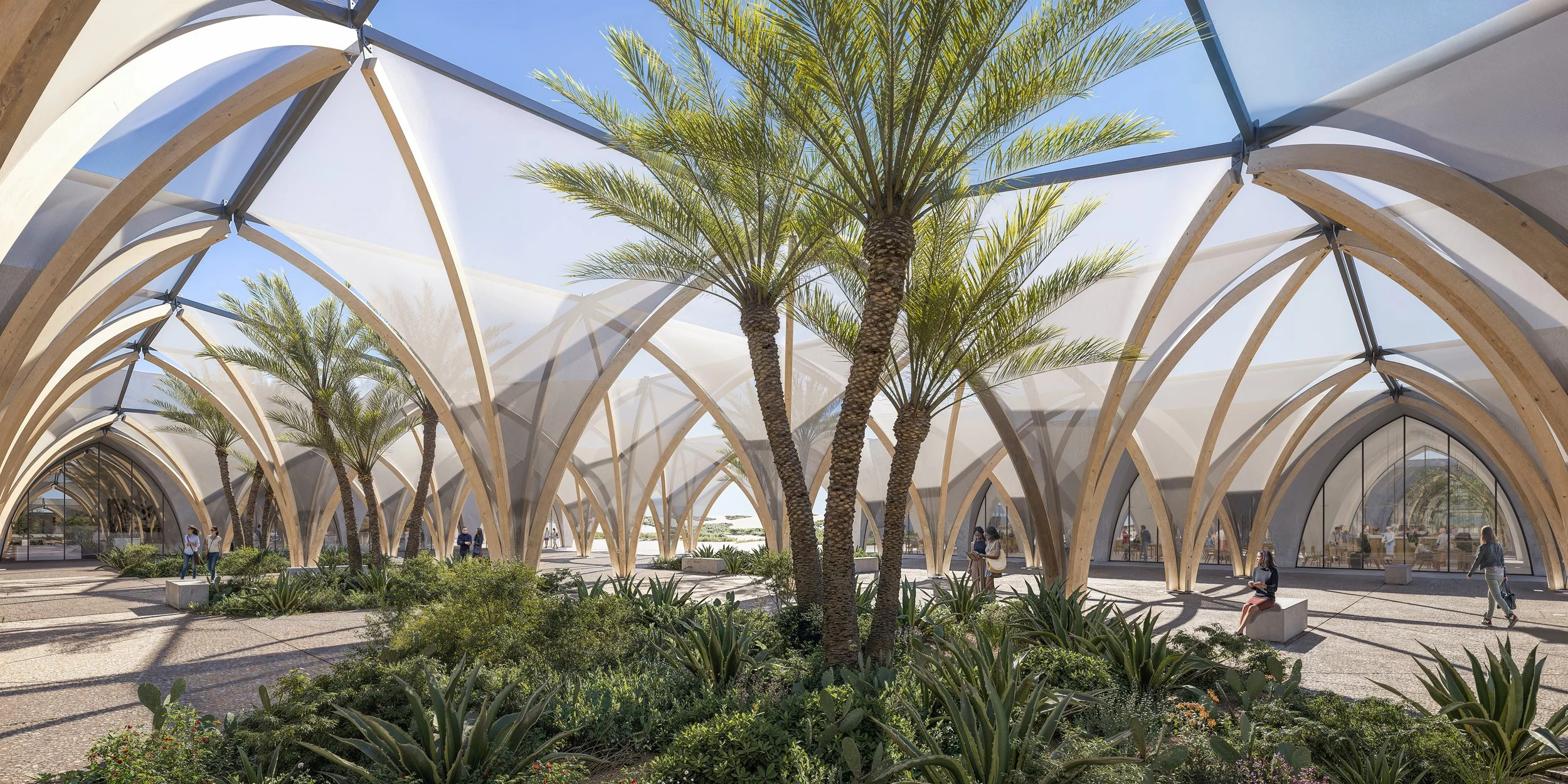L’UM6P est constituée de quatre grandes entités programmatiques : l’administration, les salles de classes, les résidences et le restaurant universitaire, totalisant 12 500 m² net. Elles s’agglomèrent autour de patios - verdoyants d’essences locales et à l’abri des vents et de l’horizon - propices aux rencontres entre étudiants et professeurs. Ces différentes parties du projet sont reliées entre elles par une canopée, également héritée du projet du FMI, constituée d’arc en bois habillés de toiles perforées qui filtrent la lumière naturelle et distinguent un dedans d’un dehors dans ce grand paysage.